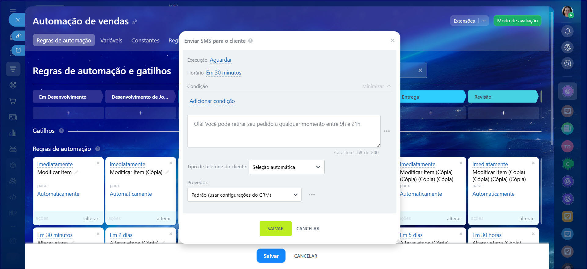 Por exemplo, sua empresa trabalha com reparos de automóveis. Para otimizar o trabalho da equipe, configure uma regra de automação que envie SMS automaticamente aos clientes. Pode ser uma mensagem informando que o carro está pronto para ser retirado. Para isso, configure a regra de automação na etapa desejada e mova o negócio para ela.