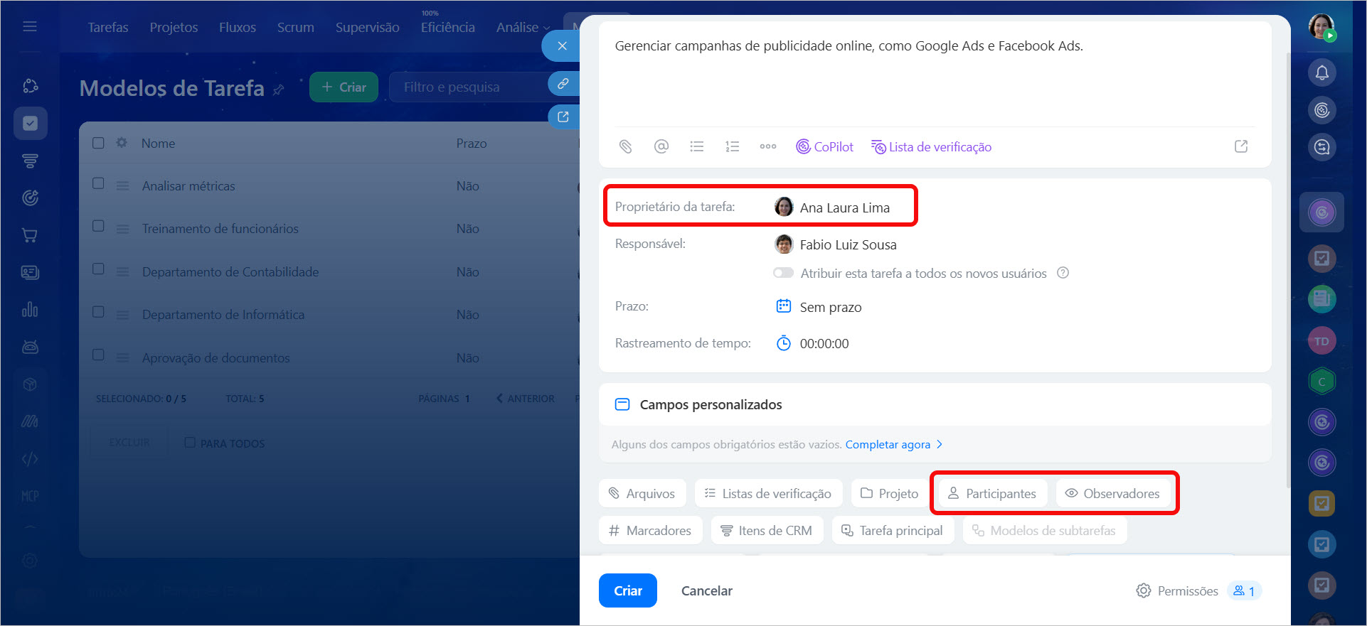 Adicione outros participantes - você pode adicionar participantes e observadores ao modelo. Os participantes ajudam a executar a tarefa e trabalham nela. Os observadores acompanham o andamento, mas não participam da execução.