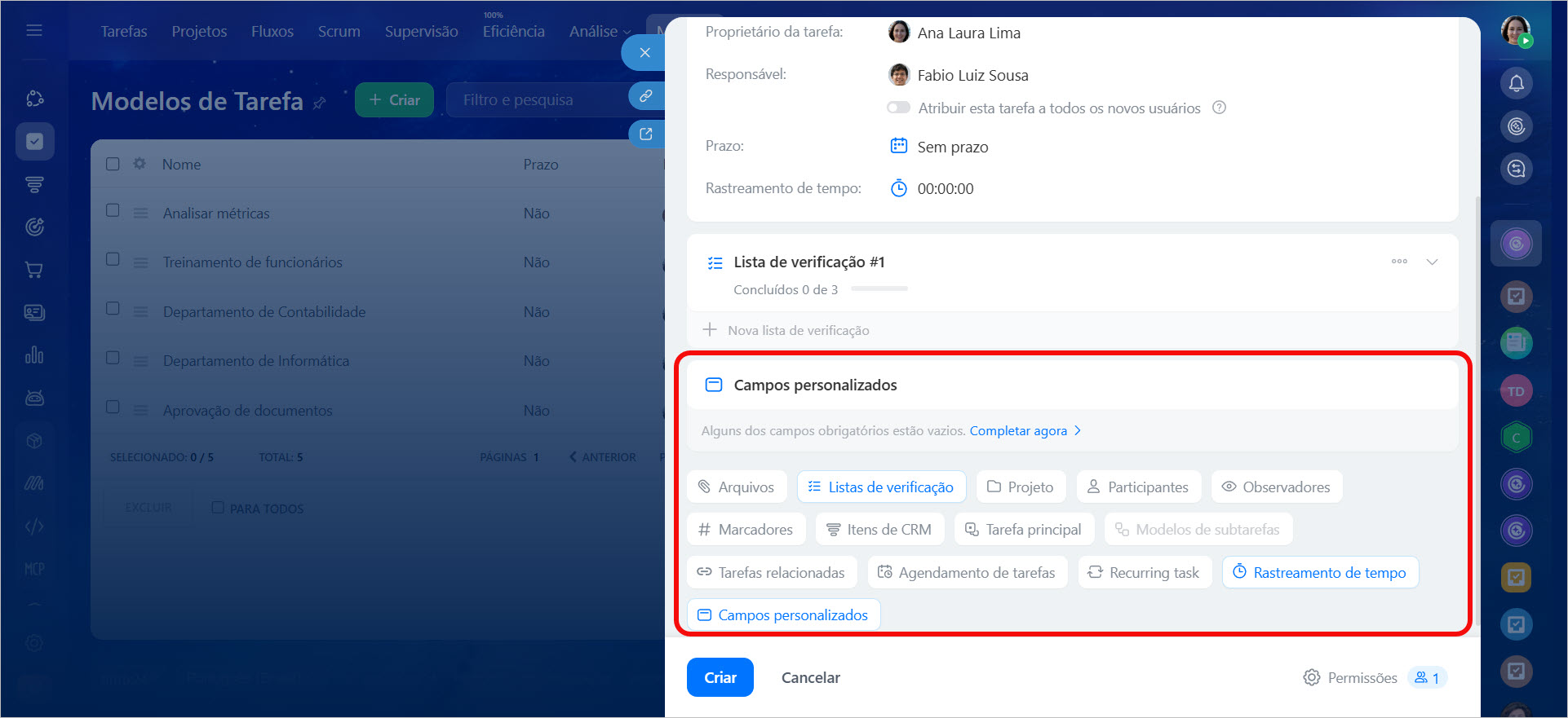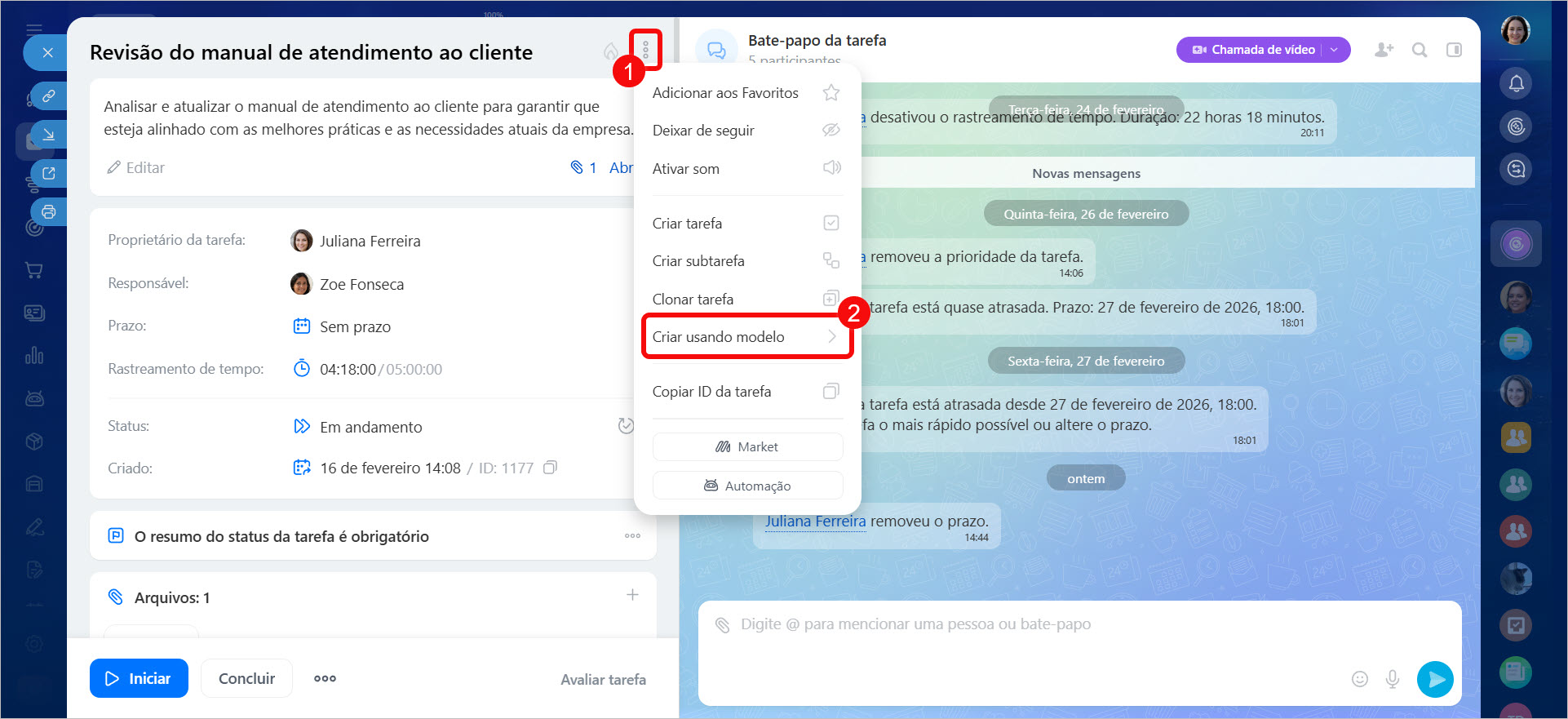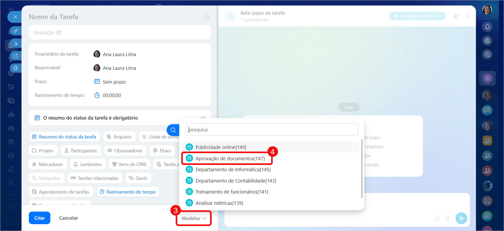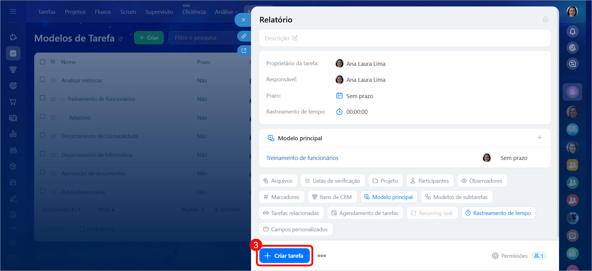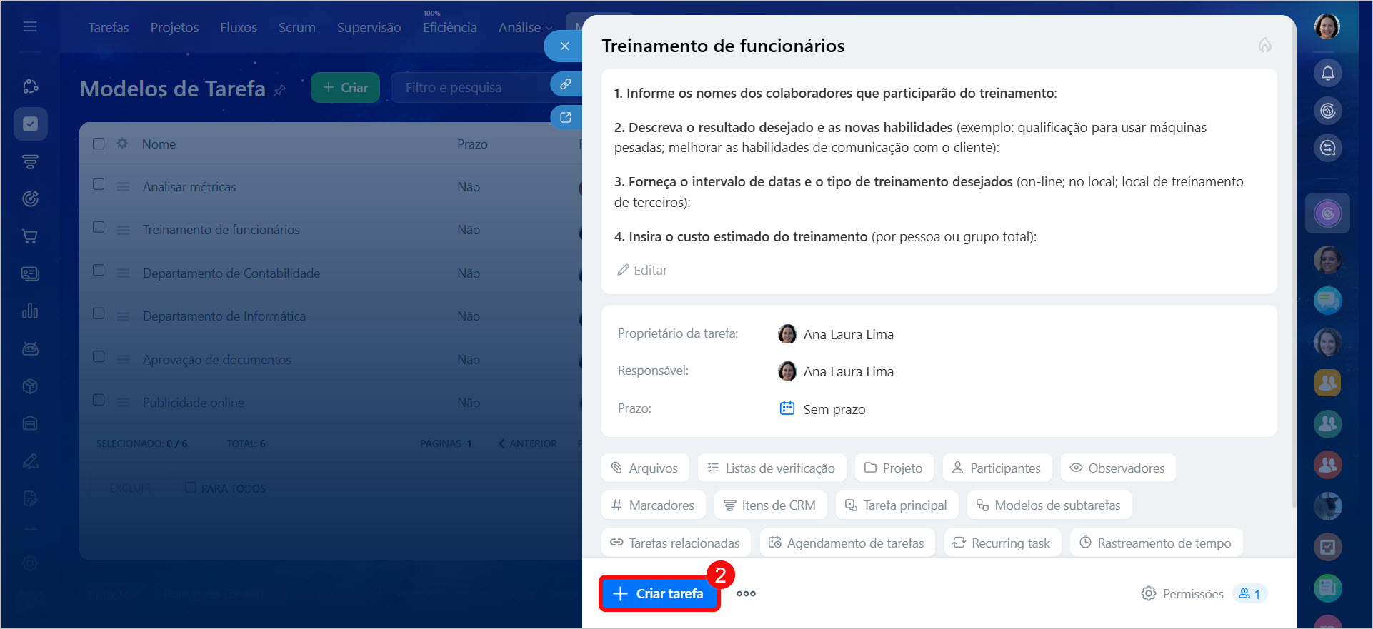 Isso é útil se você costuma atribuir tarefas recorrentes (como integrar um novo colaborador ou preparar um relatório mensal). Não é necessário preencher a descrição, anexar arquivos e descrever as etapas toda vez. O colaborador já recebe uma tarefa completa e estruturada, entendendo exatamente o que precisa ser feito.