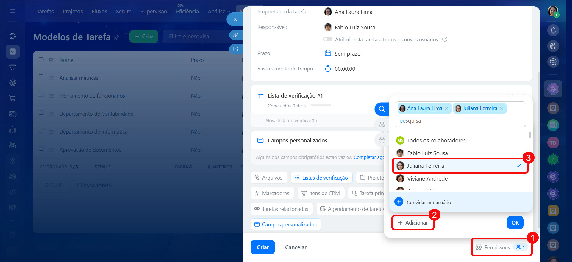 Por padrão, todos os colaboradores podem criar modelos de tarefa. Essa permissão pode ser restrita nas configurações de acesso.