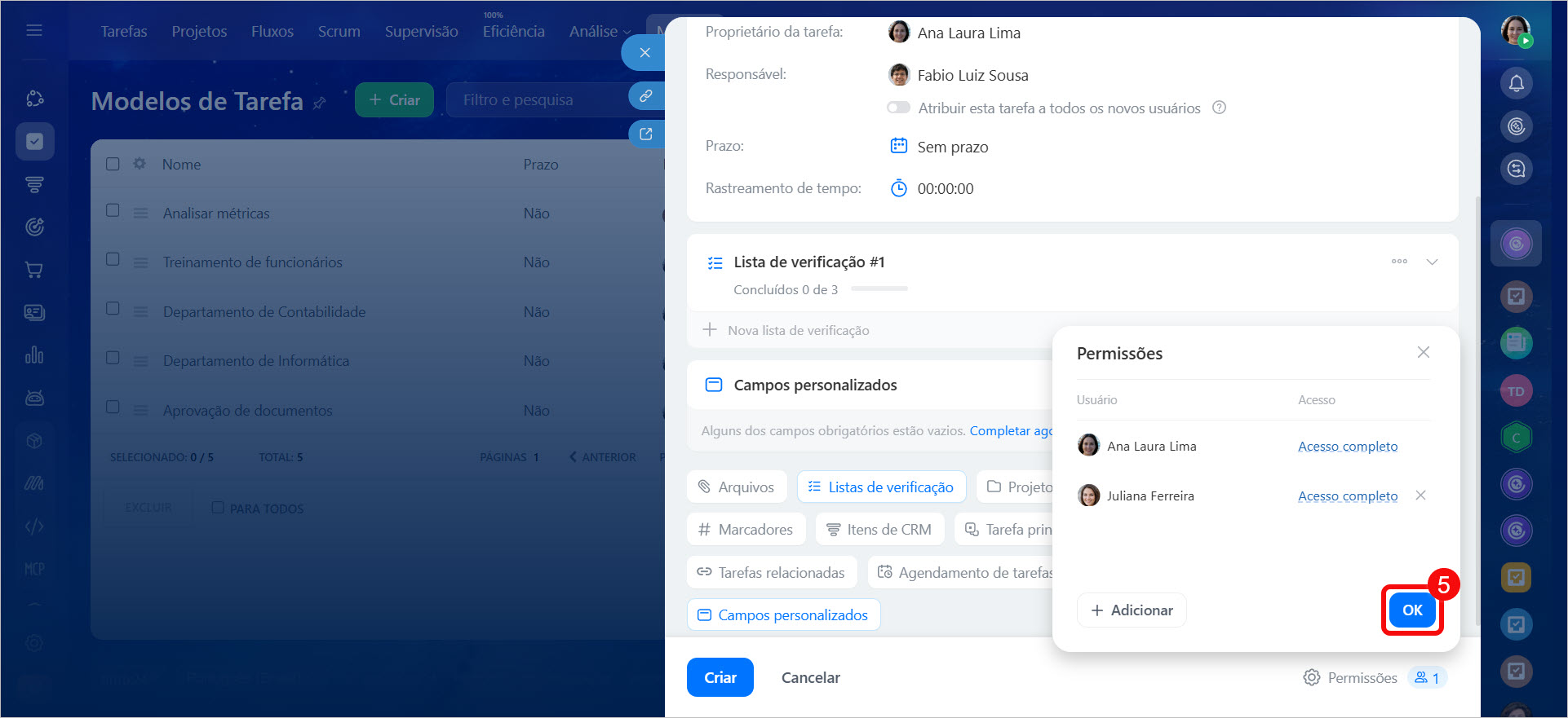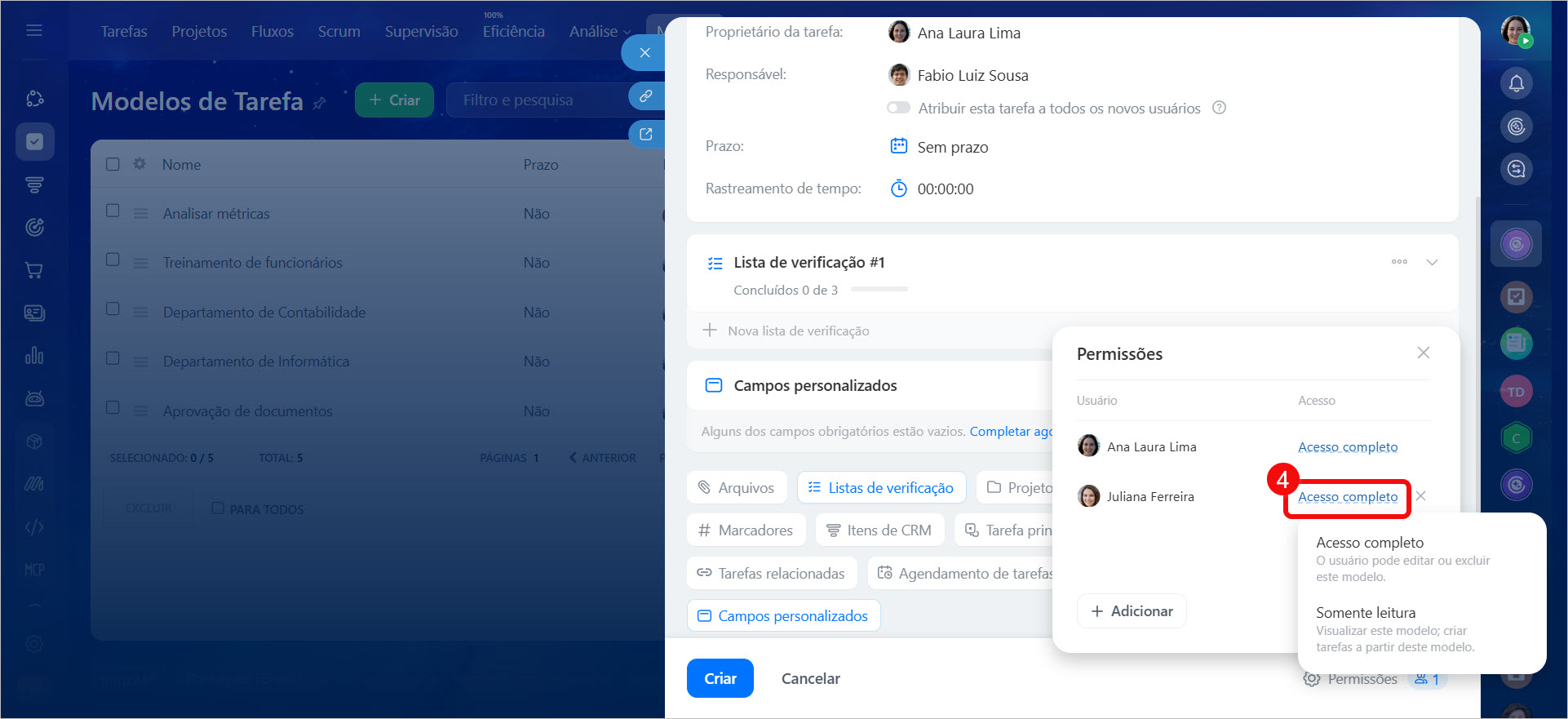 Configure as permissões de acesso - defina quem pode apenas criar tarefas baseadas neste modelo e quem pode editar o modelo em si.