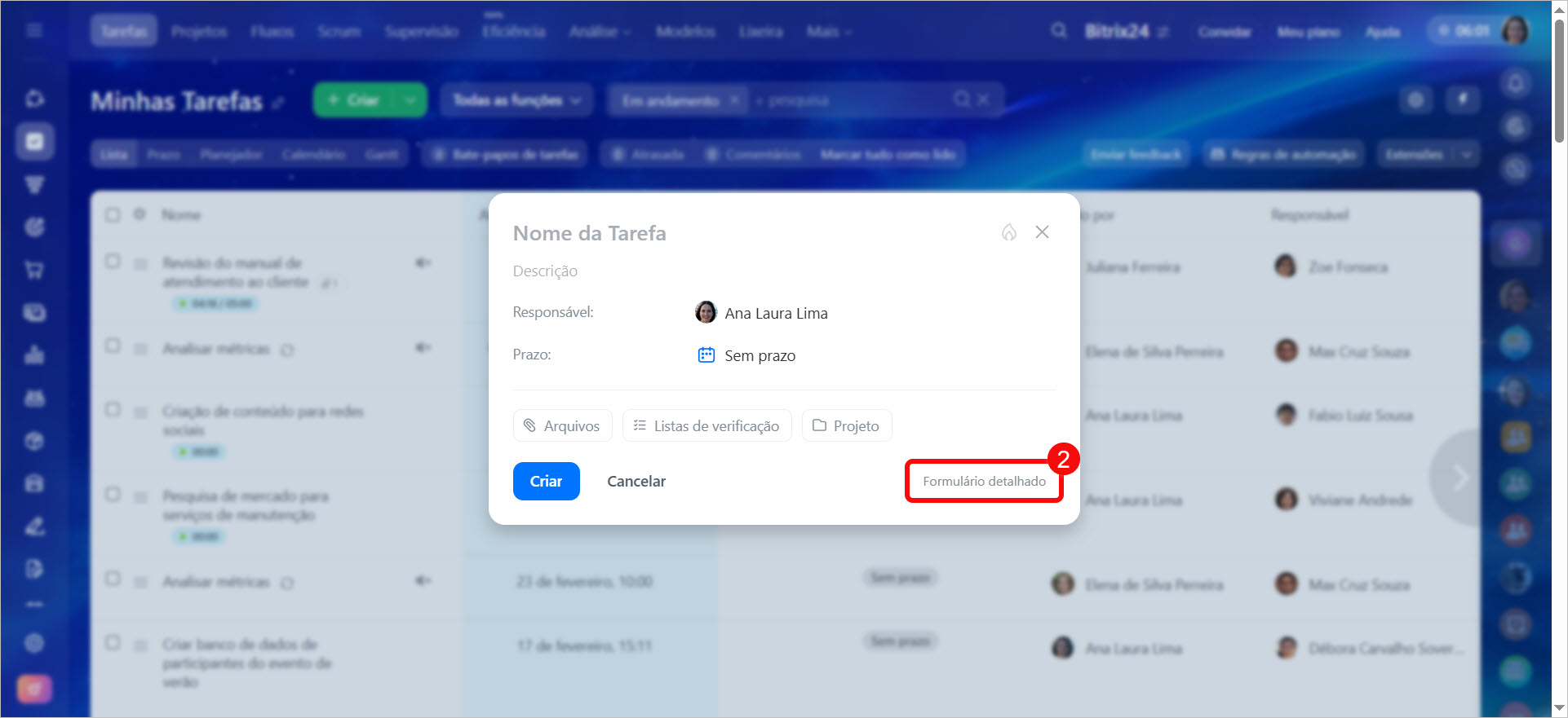 Na página da nova tarefa. Na seção Tarefas e Projetos, clique em Criar. Na página da tarefa, selecione Formulário detalhado. Clique no bloco Modelos na parte inferior da página e escolha o desejado.
