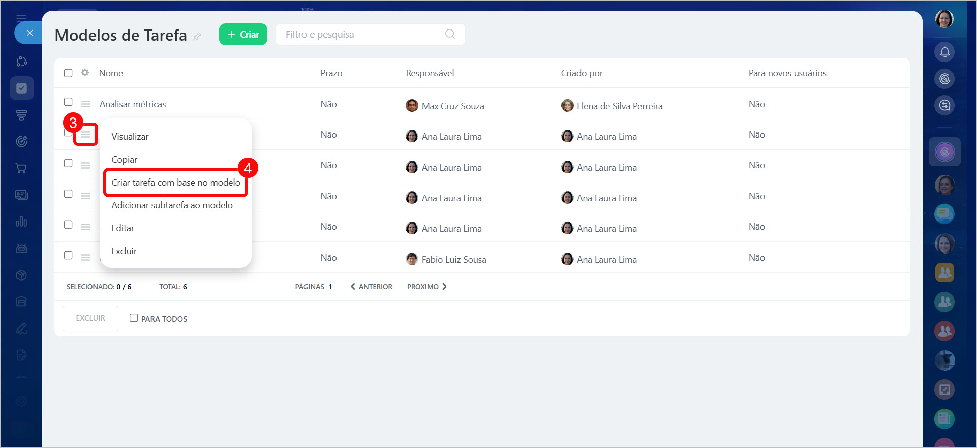 3–4. Ao lado do modelo desejado, clique em Menu (≡) > Criar tarefa com base no modelo. Uma nova tarefa será criada no Bitrix24.