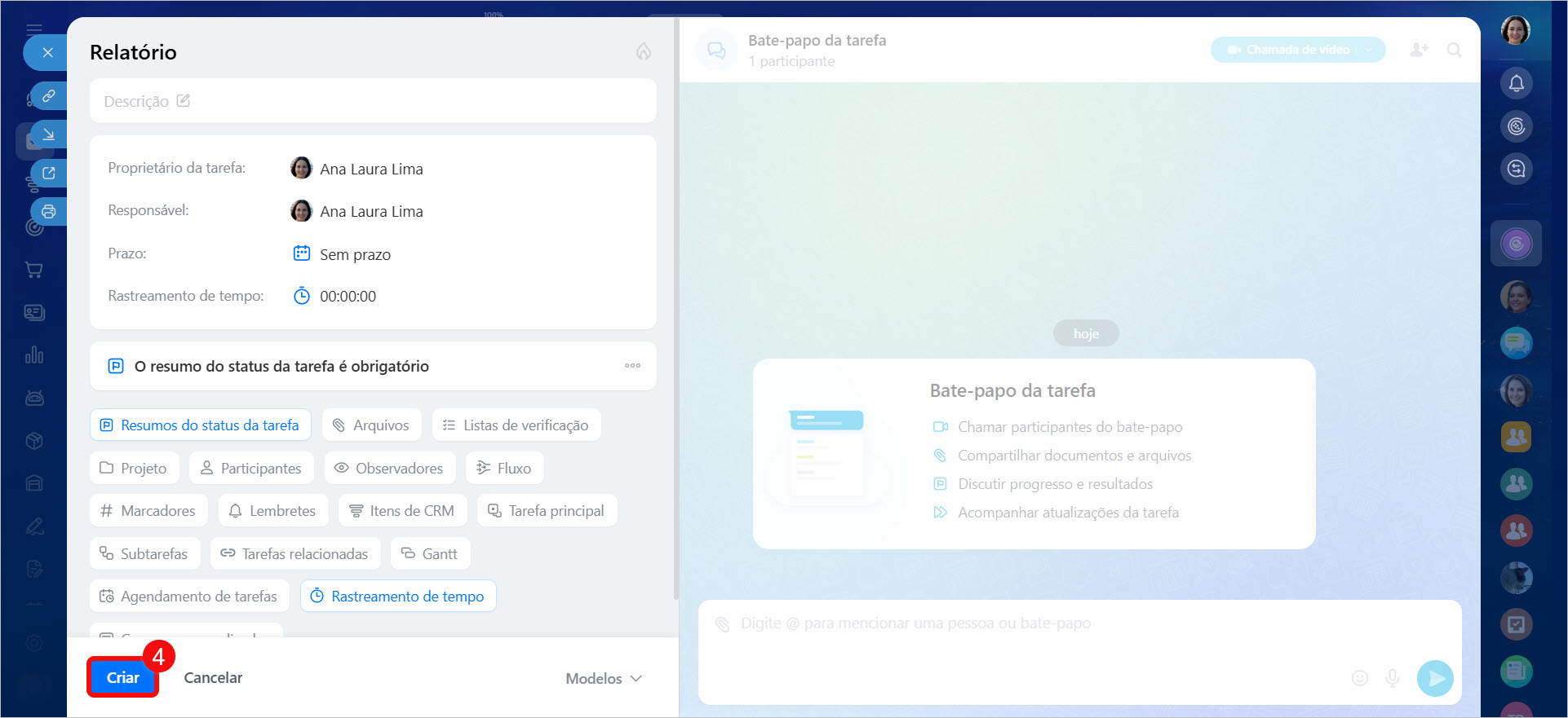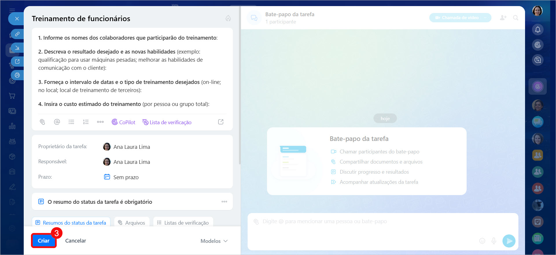 Adicione uma descrição - escreva uma instrução ou indique quais dados precisam ser preenchidos na tarefa. O colaborador poderá complementá-la ao criar a tarefa específica, o modelo em si não será alterado.