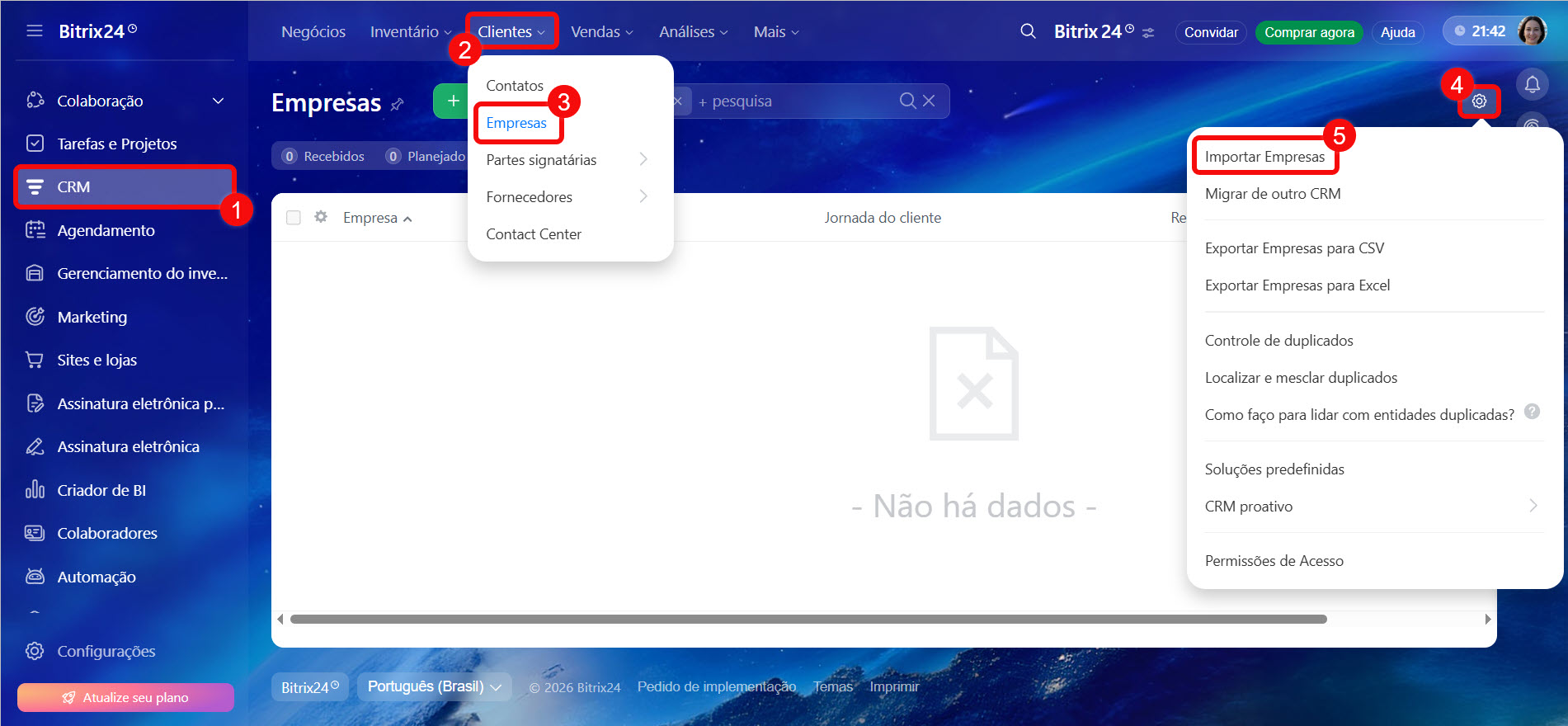 Acesse CRM > Clientes > Empresas. Clique em Configurações (⚙️) à direita e selecione Importar empresas.