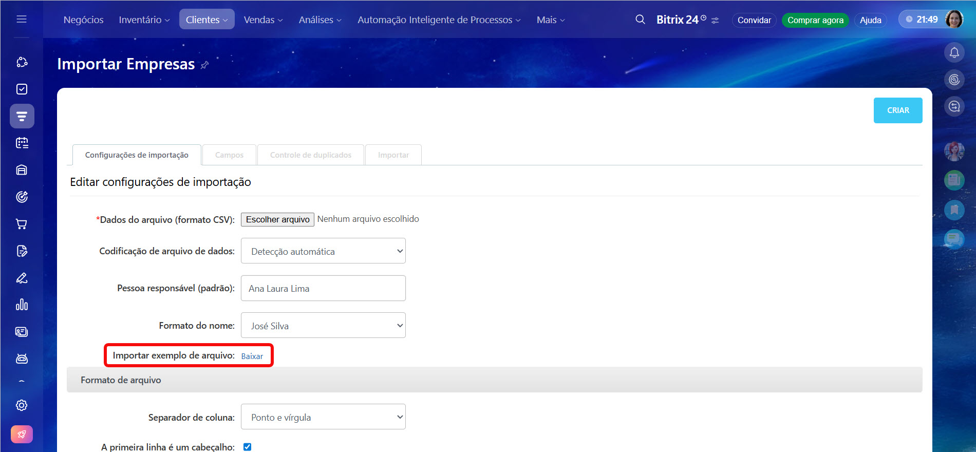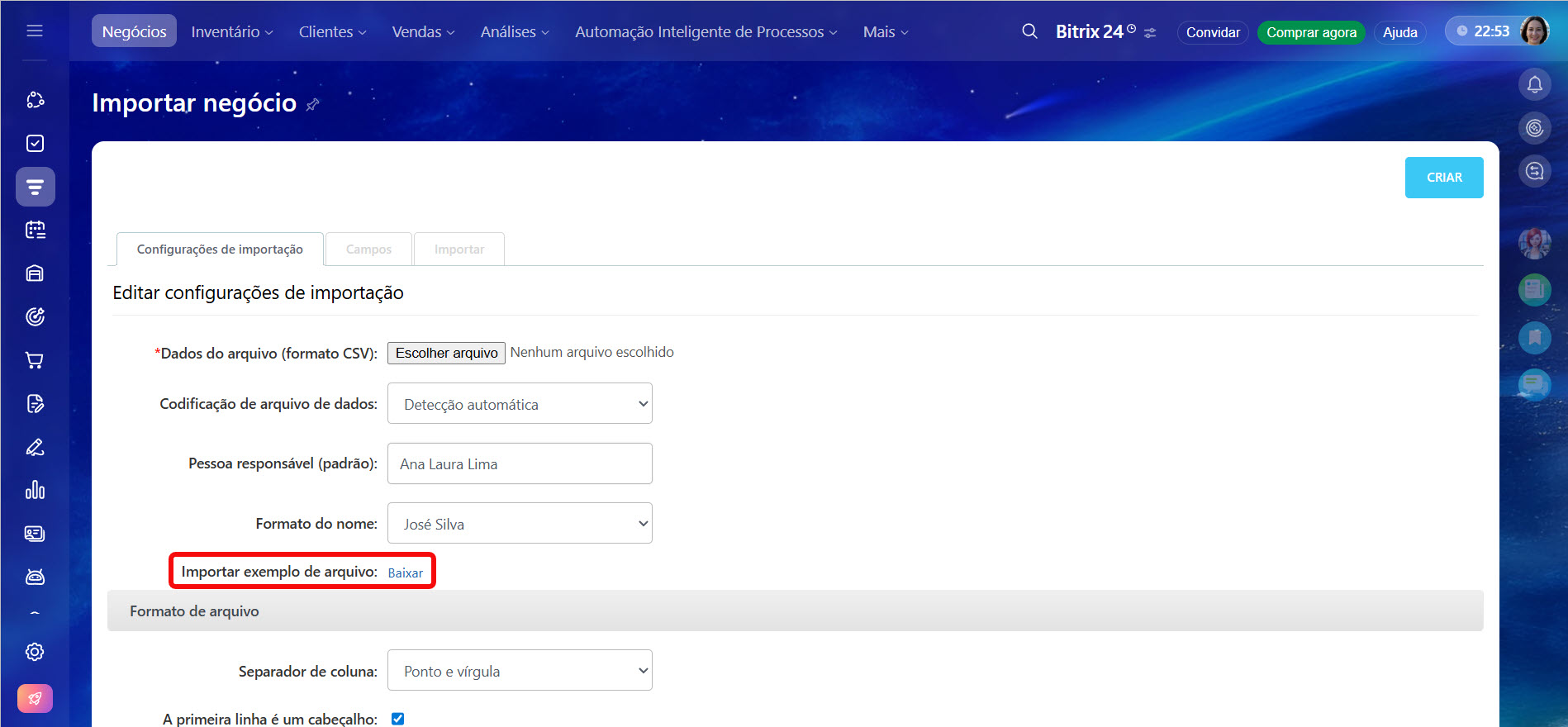 - Baixe o modelo de arquivo de importação, preencha e faça o upload em sua conta Bitrix24.
