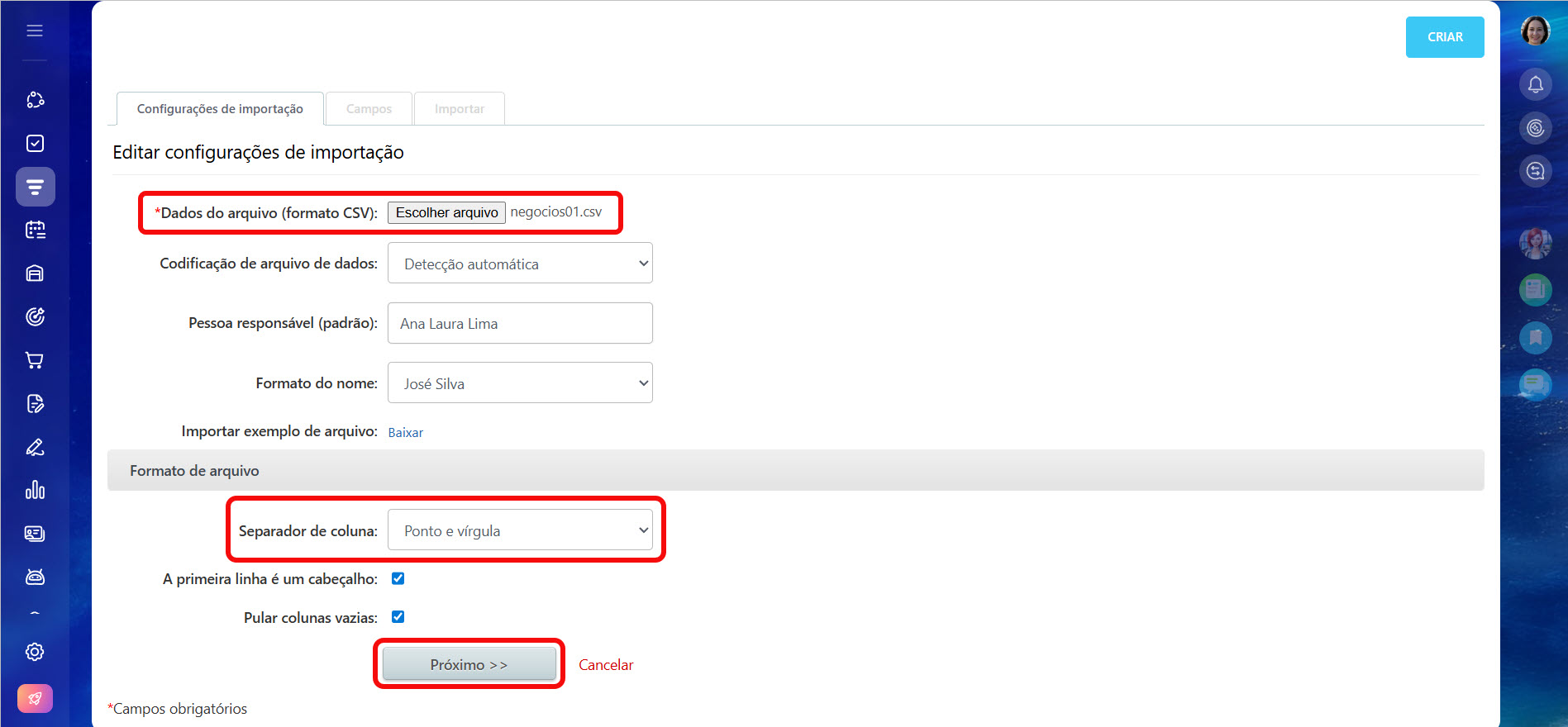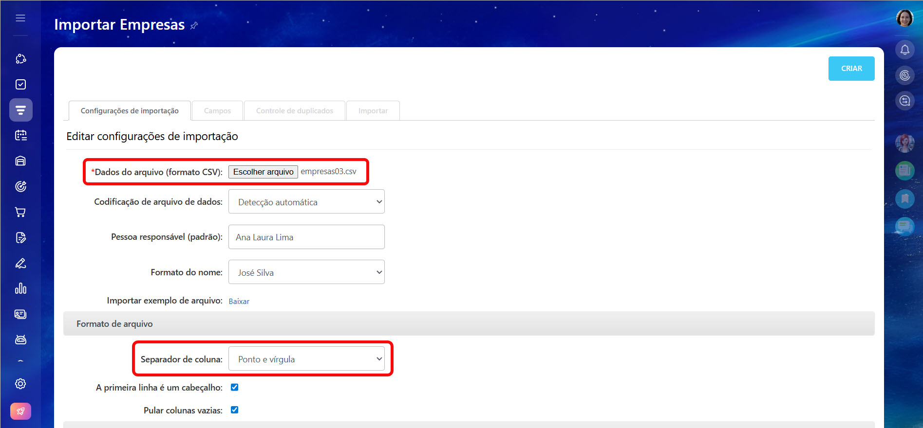 Certifique-se de que o Separador de colunas selecionado é o mesmo caractere usado para separar os valores no seu arquivo de importação. Caso contrário, os campos do arquivo não serão interpretados corretamente.