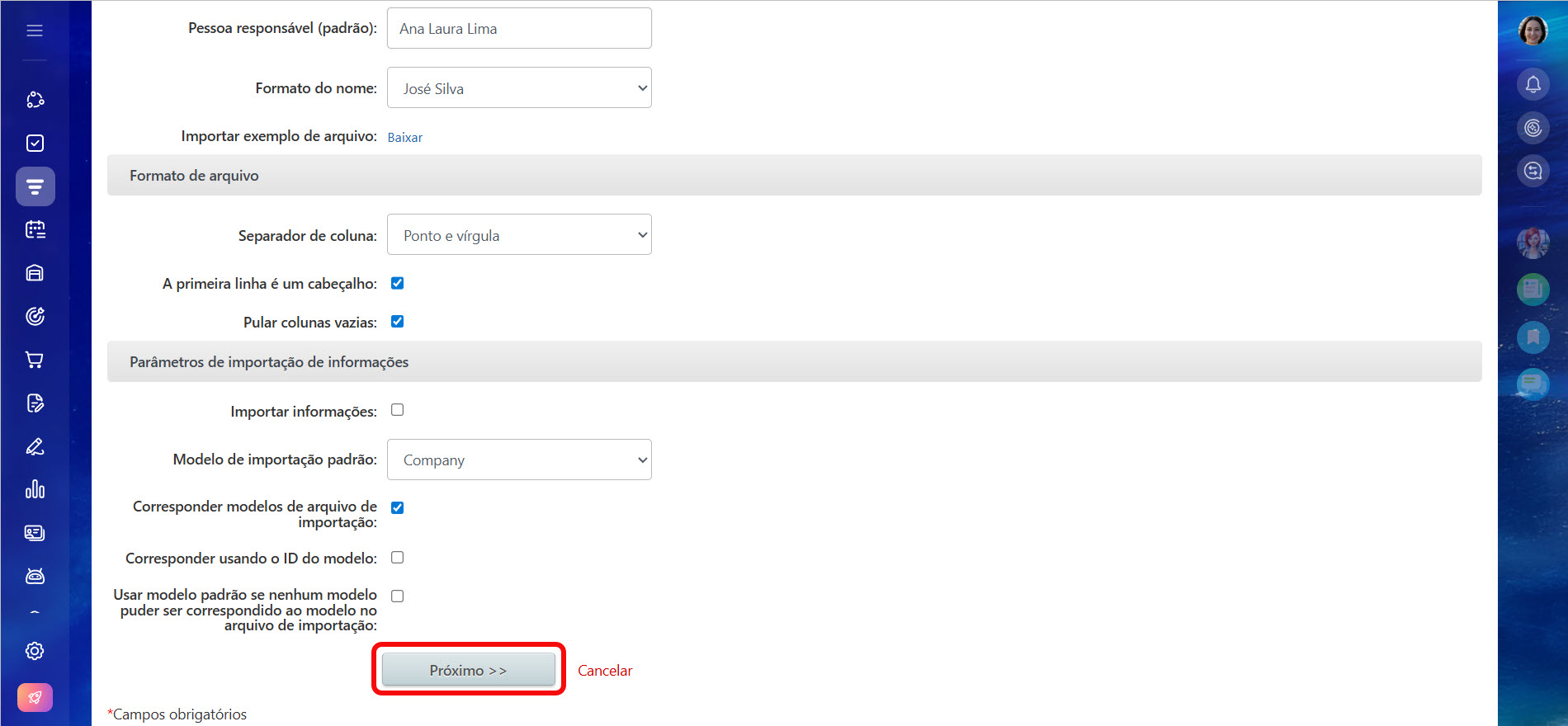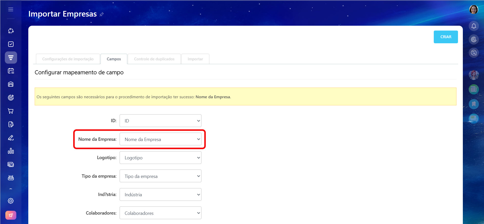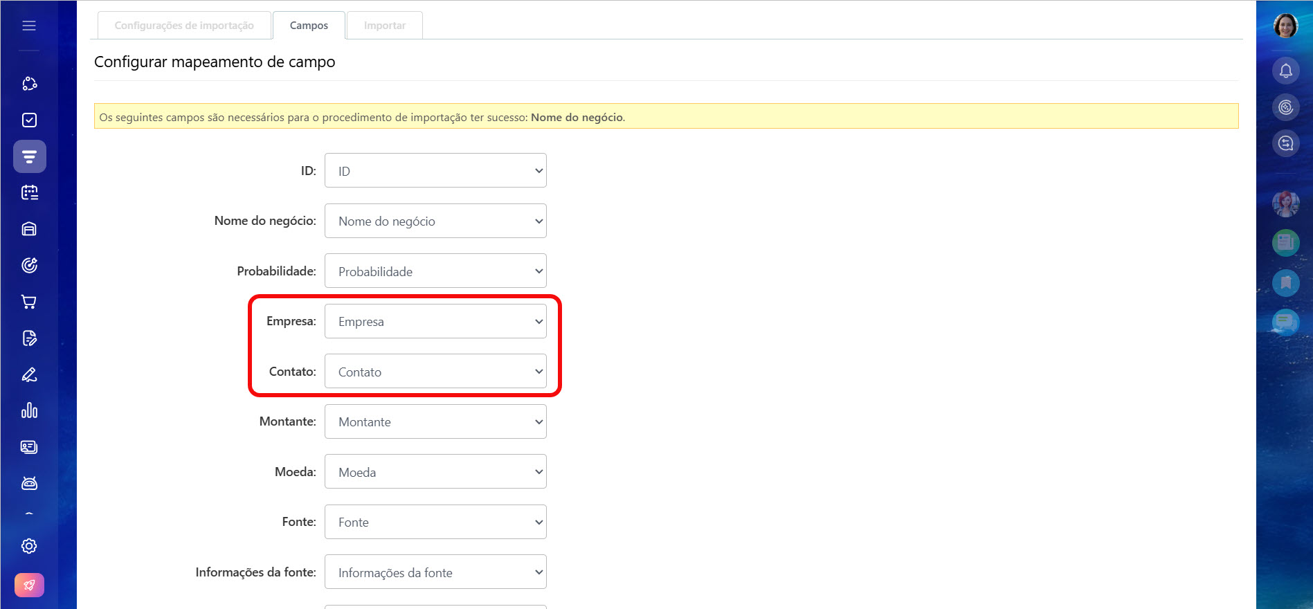 - Verifique se os campos no arquivo de importação correspondem aos campos corretos no cartão do CRM. Por exemplo, os dados do campo Nome da empresa no arquivo devem ser importados para o campo Nome da empresa no cartão.