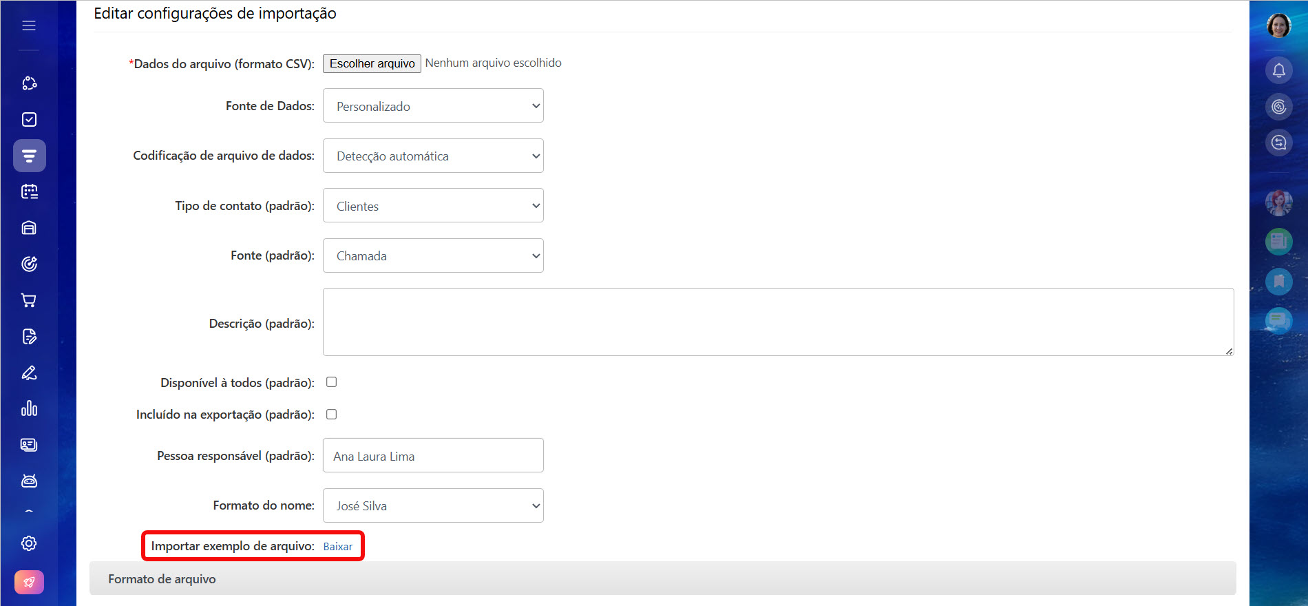 Faça o upload do arquivo de importação no campo Arquivo de dados. Ele deve estar no formato csv.