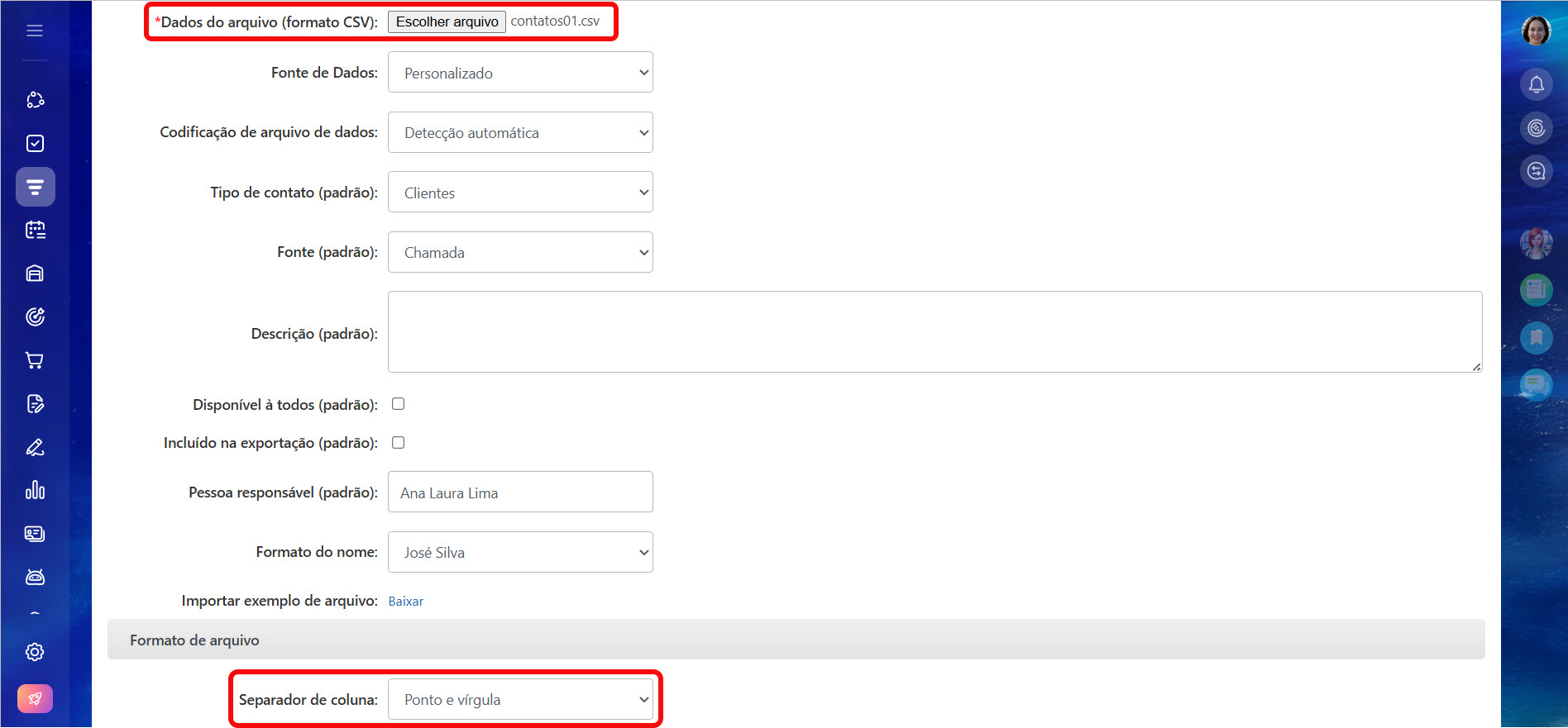 O modelo de arquivo de importação utiliza o ponto e vírgula como separador. Após a edição dos dados, o separador pode ser alterado, dependendo do programa utilizado.