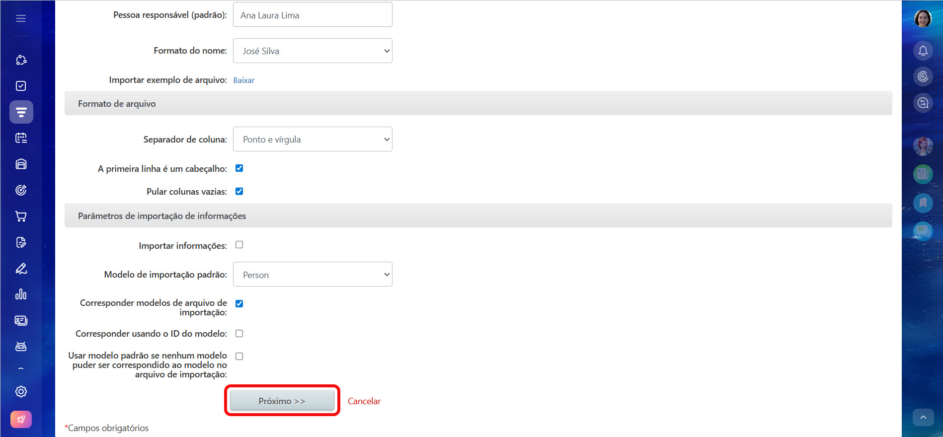 Verifique a correspondência dos campos. Os campos no arquivo de importação devem estar corretamente mapeados para os campos no cartão do CRM. Por exemplo, os dados do campo Nome da empresa no arquivo devem ser importados para o campo Nome da empresa no cartão. Clique em Avançar.