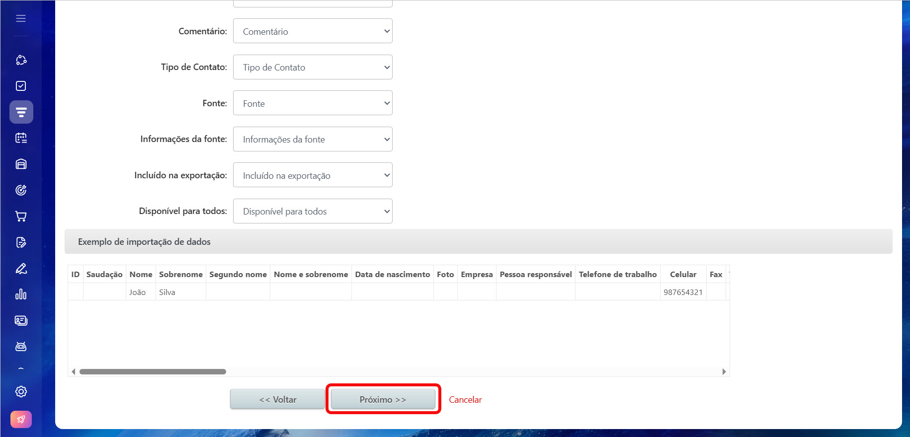 Verifique a correspondência dos campos. Por exemplo, os dados do campo Empresa no arquivo devem ser importados para o campo Empresa no cartão, e os dados do campo Contato, para o campo Contato.