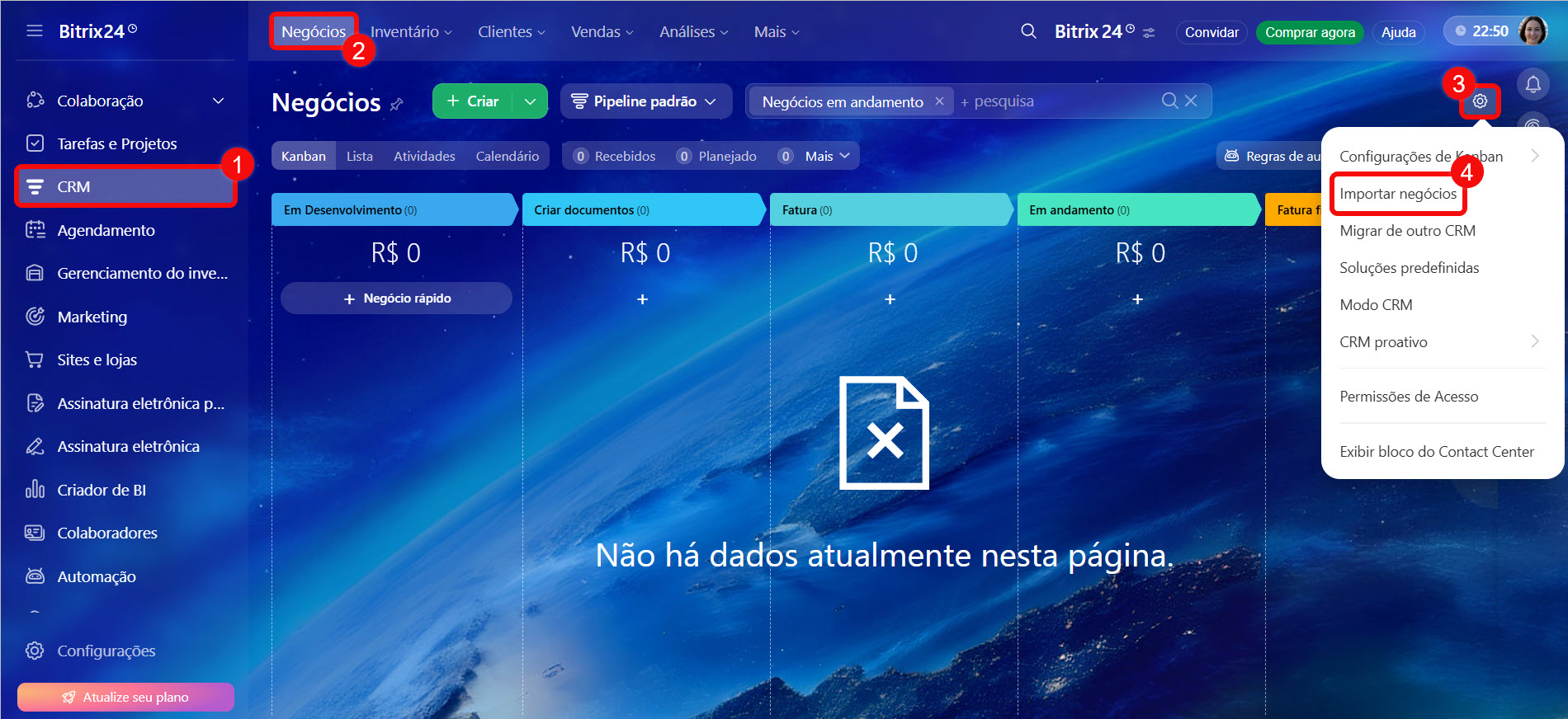Acesse CRM > Negócios. Clique em Configurações (⚙️) à direita e selecione Importar negócios.