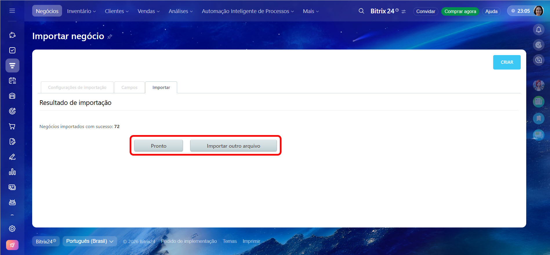 Conclua a importação. Se precisar importar outro arquivo, clique em Nova importação. Os cartões dos negócios importados aparecerão na seção CRM > Negócios.