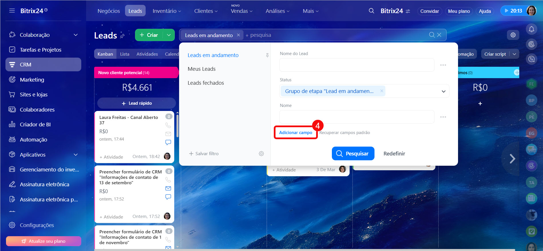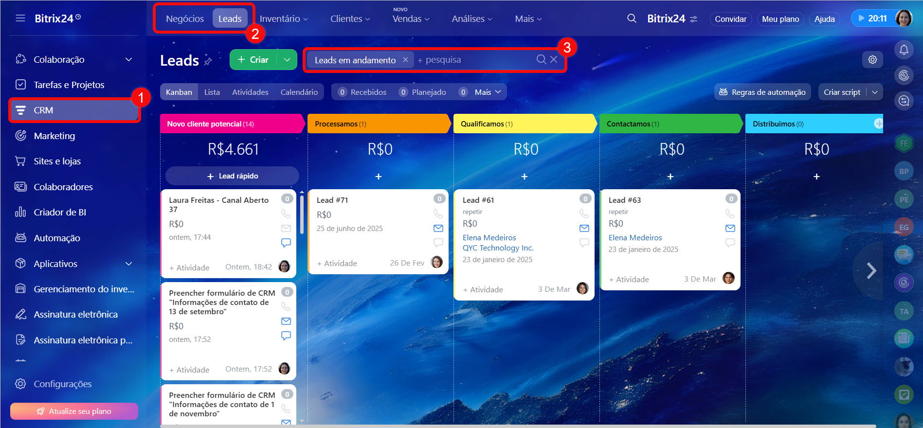 1–3. Acesse CRM > Leads ou Negócios. Clique na barra de pesquisa na parte superior.