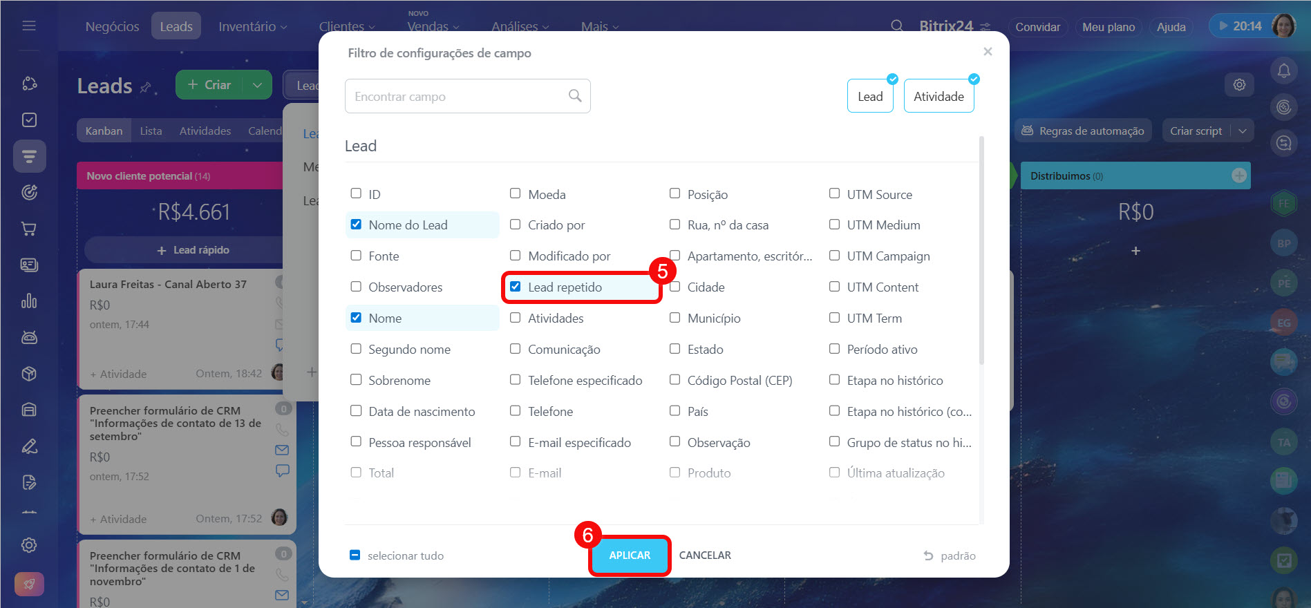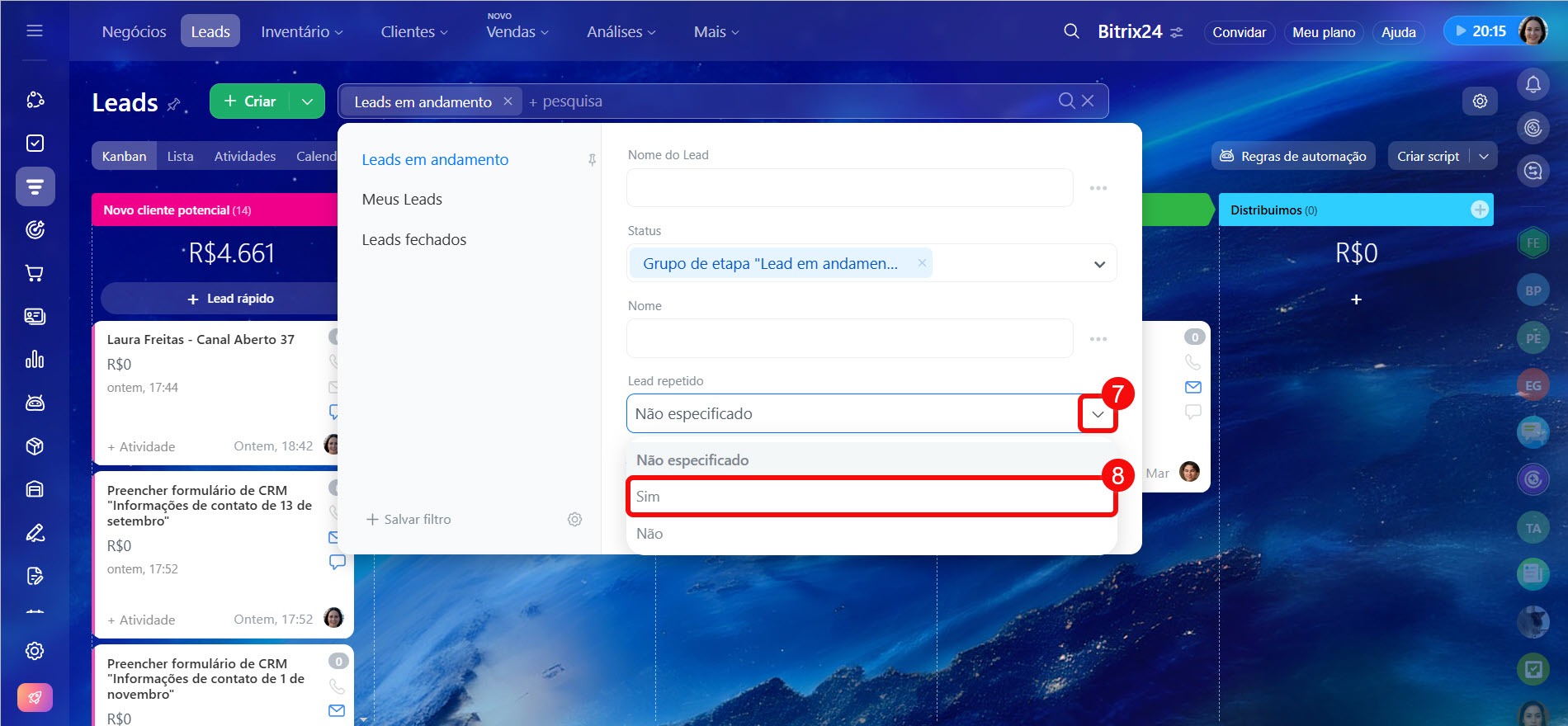 - Leads, contatos e negócios repetidos podem ser encontrados usando os filtros na seção CRM > Leads ou Negócios.