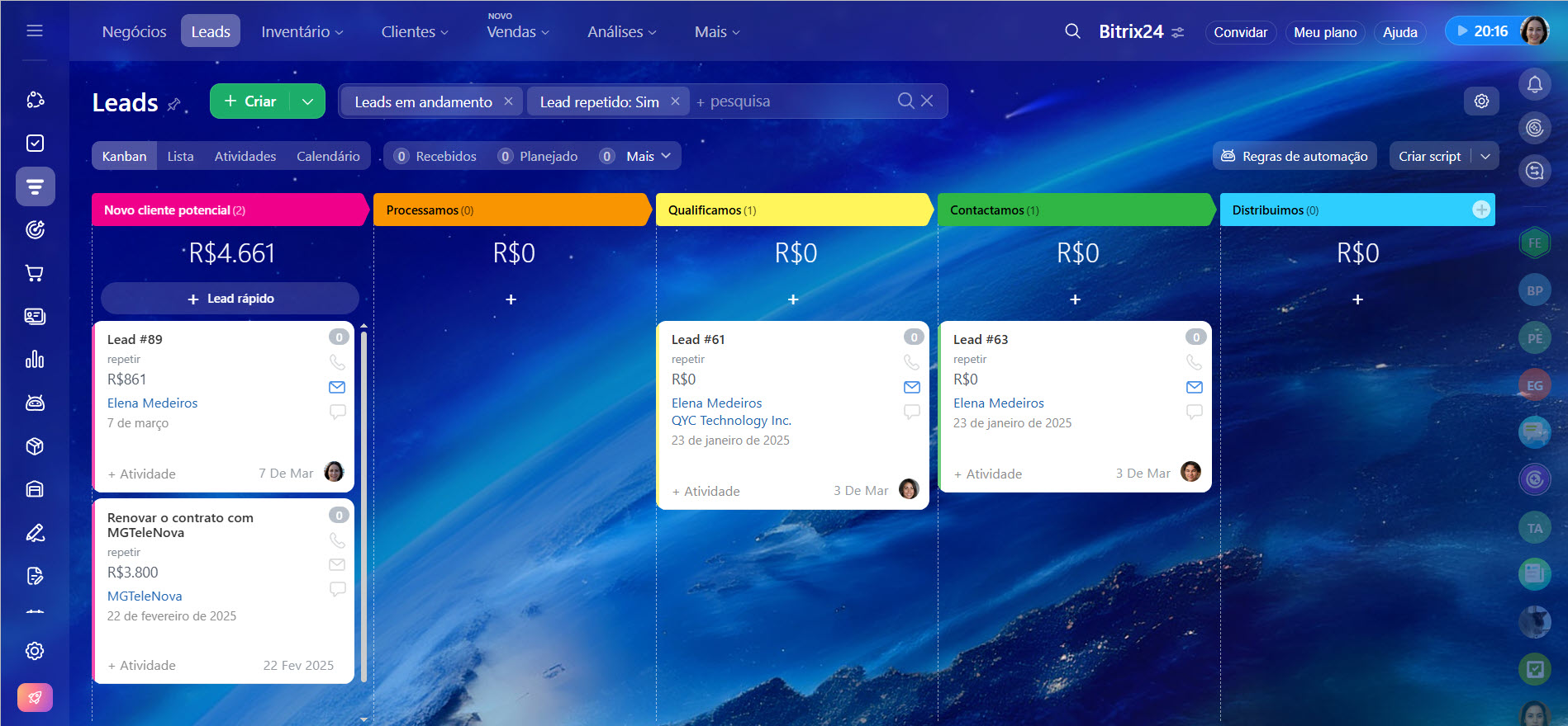 - Um lead se torna repetido quando vinculado a um contato ou empresa existente.