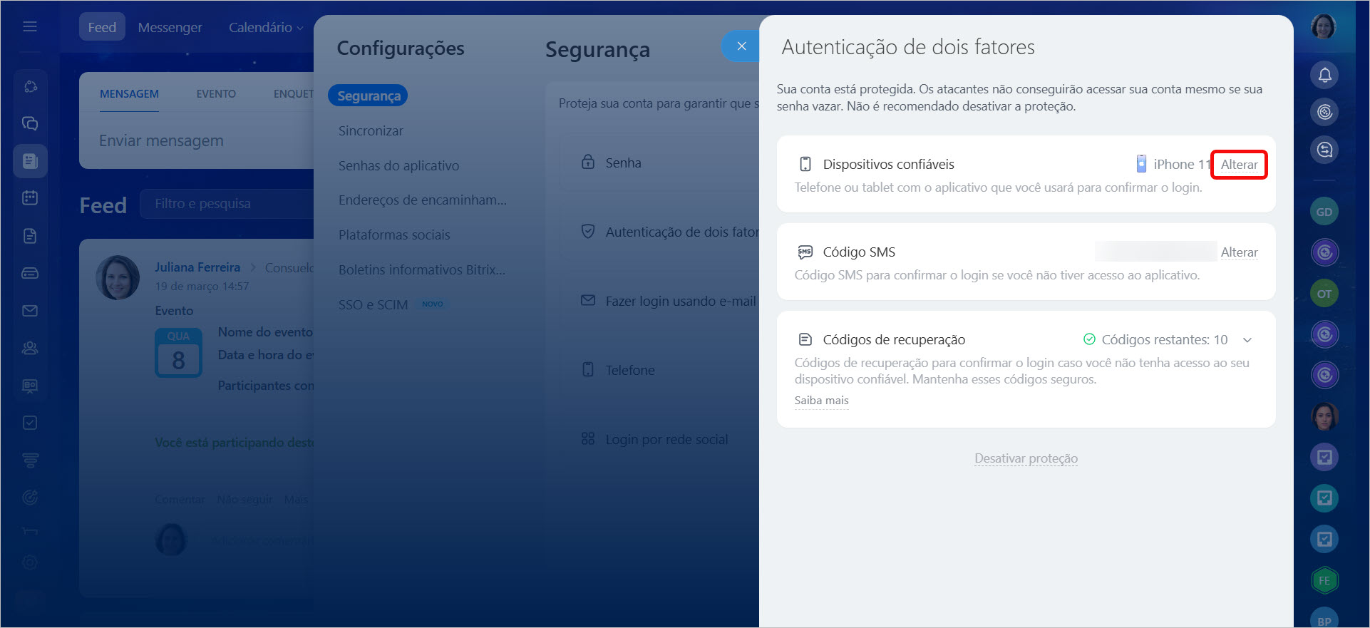 4. Reconfigure a autenticação de dois fatores. Para isso, vincule um novo dispositivo confiável. No seu perfil do usuário, vá até a seção Segurança e, no bloco Dispositivos confiáveis, clique em Alterar.
