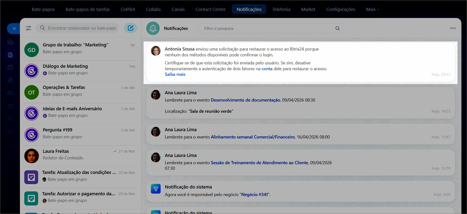 Você, como administrador, receberá uma notificação no Bitrix24. Verifique a autenticidade da solicitação entrando em contato com o colaborador por outro canal (telefone, e-mail, etc.) antes de prosseguir.