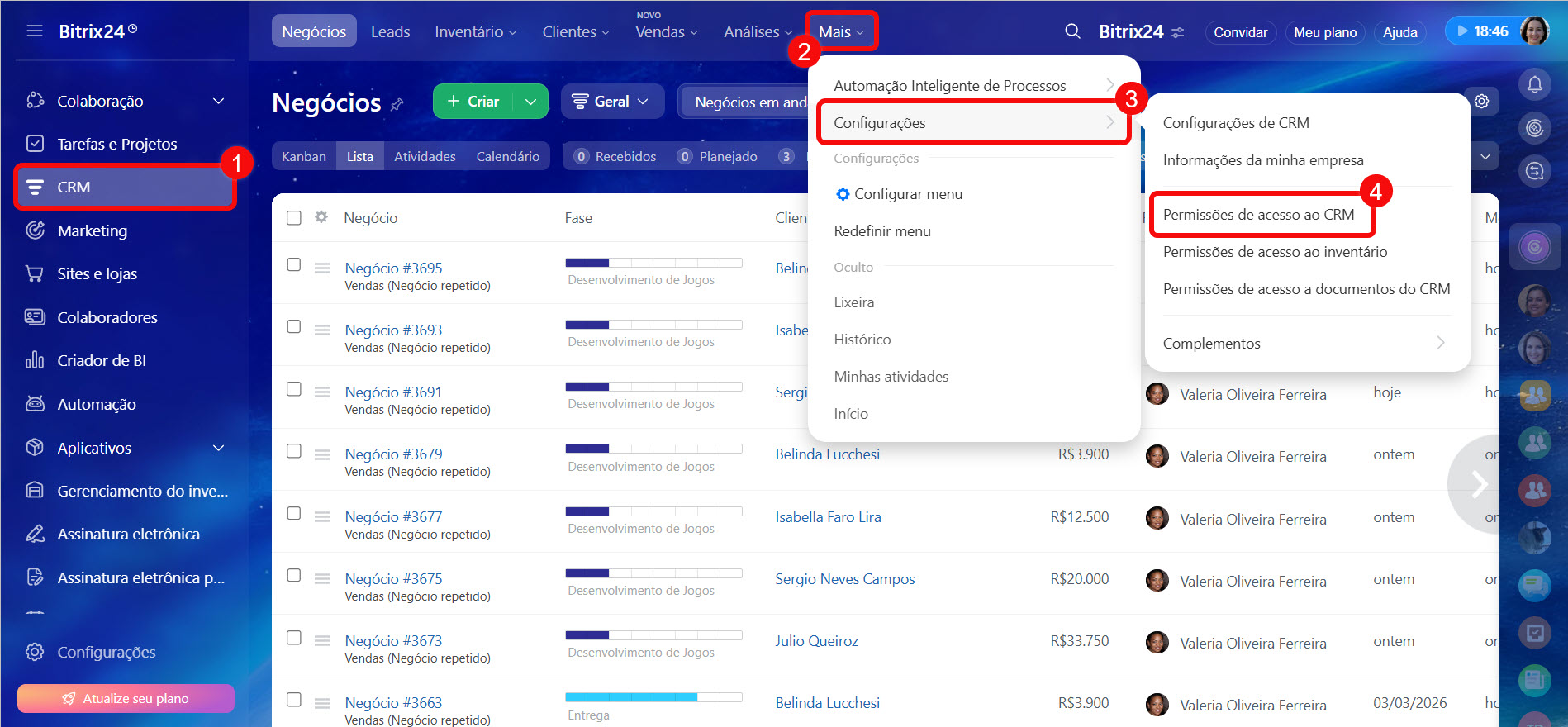 - Para configurar as permissões de acesso, acesse CRM > Mais > Configurações > Permissões de acesso ao CRM.