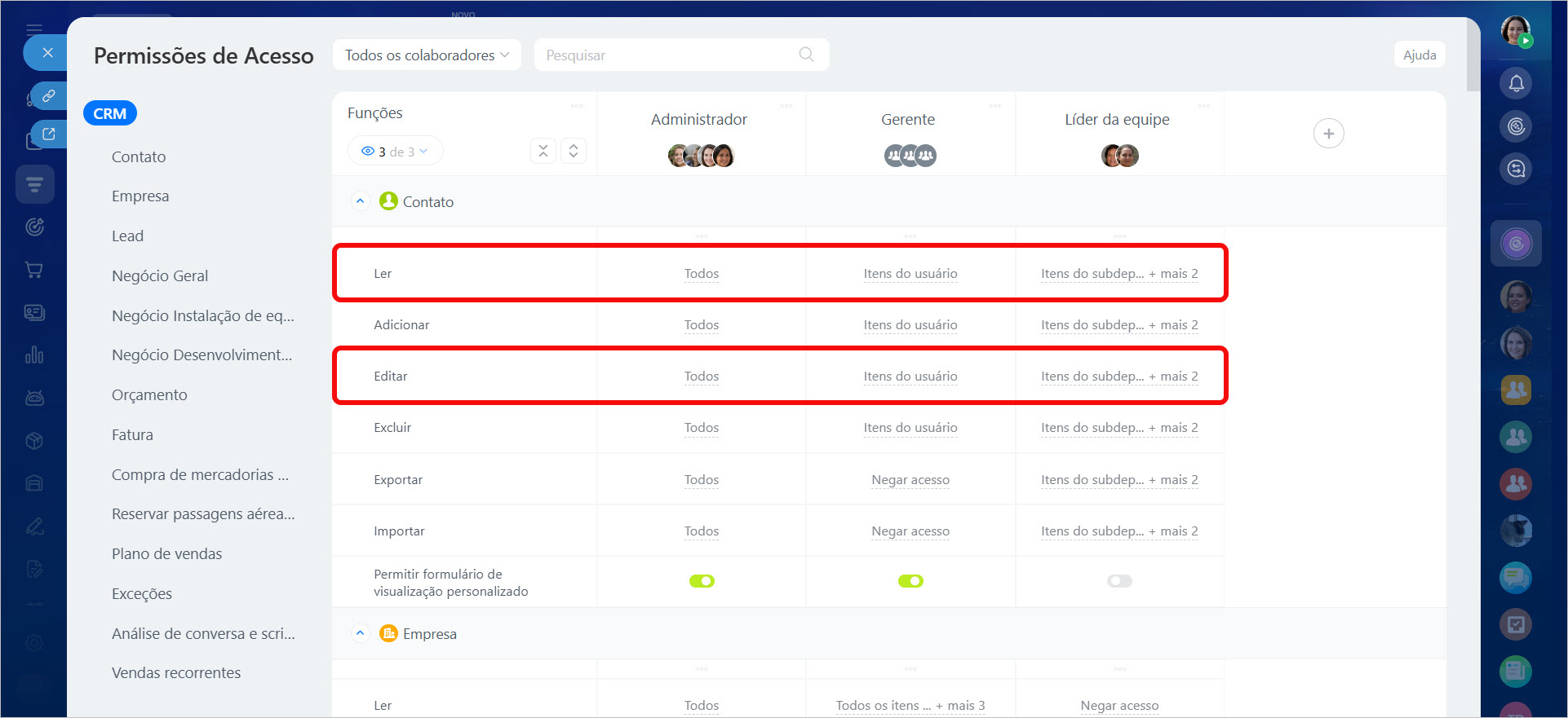 - Para que o supervisor possa ver e editar as atividades nos elementos de todos os colaboradores, configure as permissões para a função Chefe: Ler - Todos, Editar - Todos.
