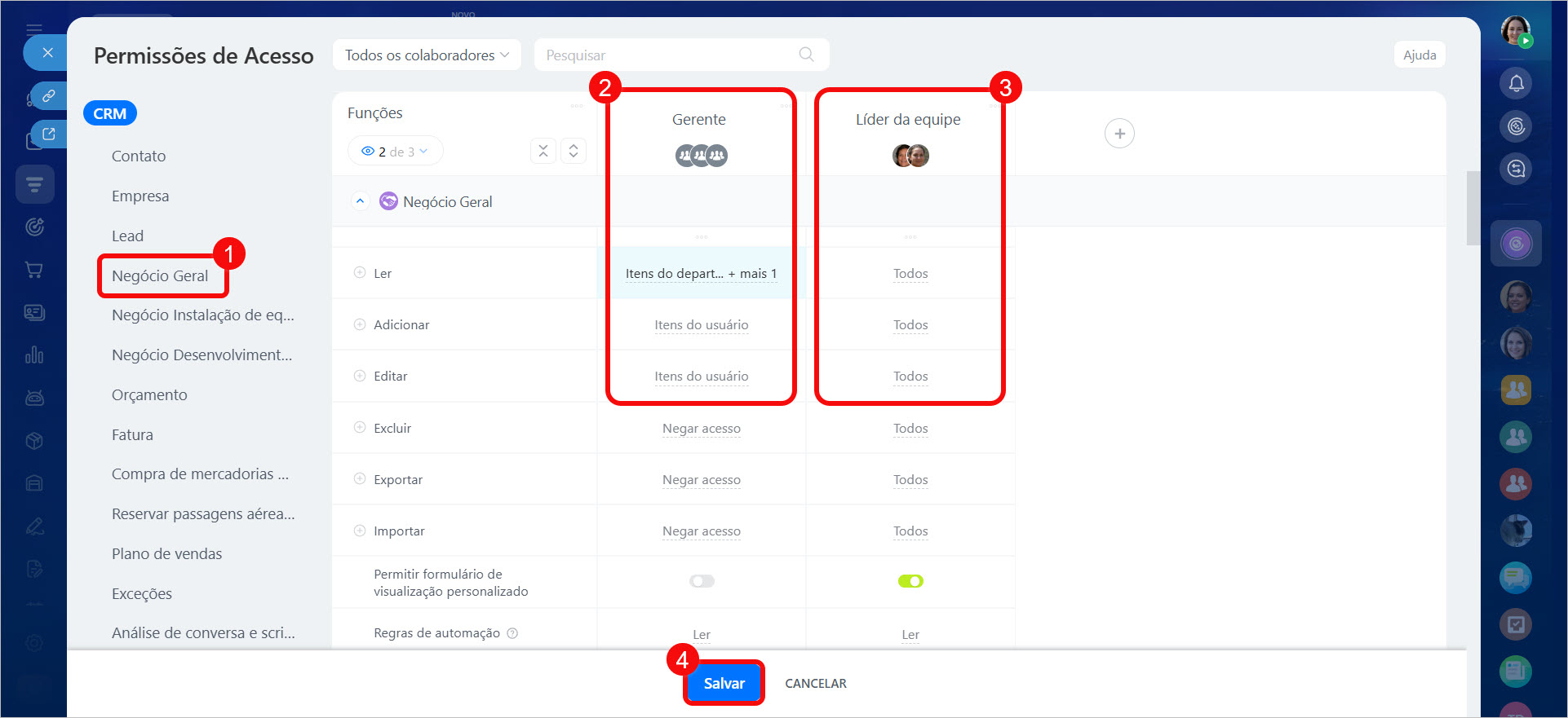 4. Clique em Salvar. As permissões serão aplicadas aos colaboradores que possuem essas funções atribuídas.
