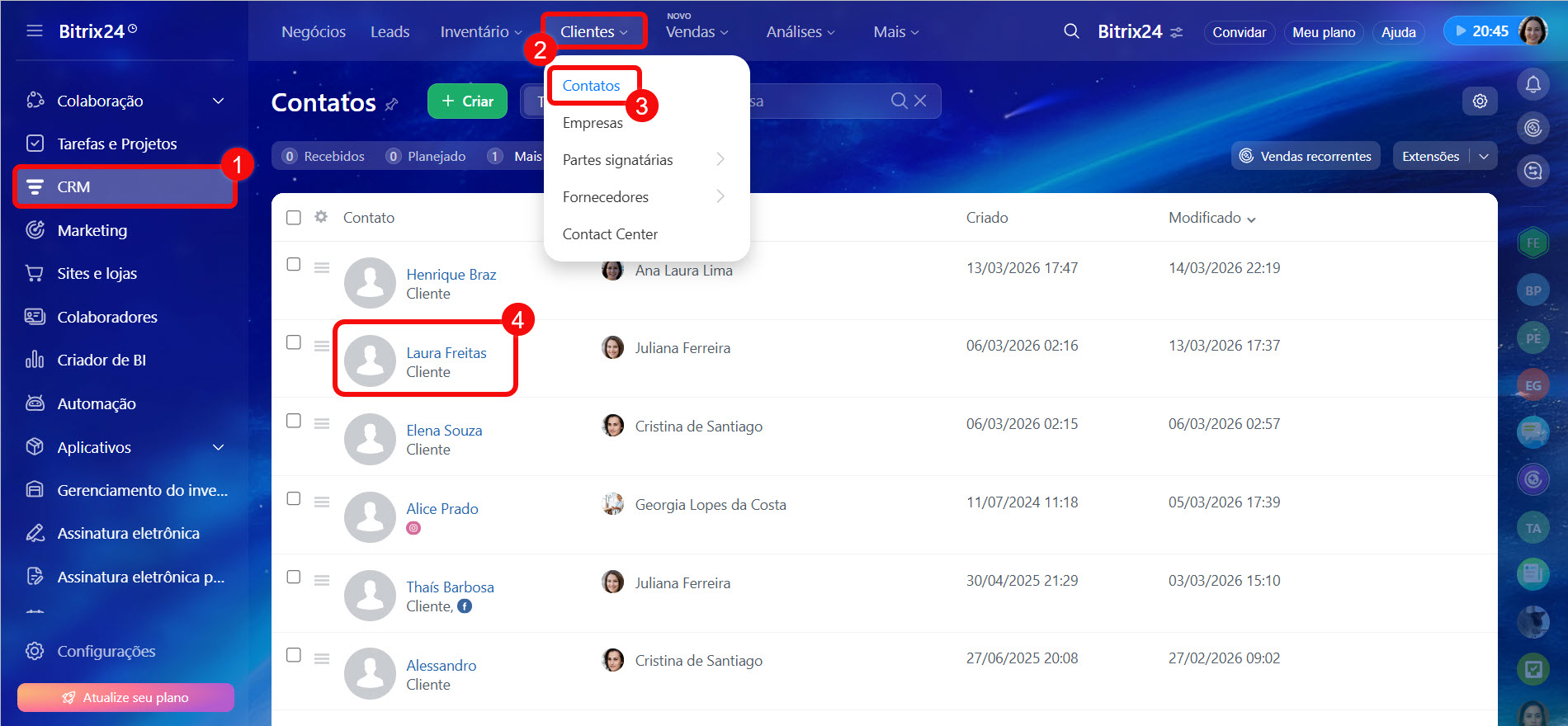 1–4. Vá em CRM > Clientes > Contatos e abra o cartão desejado.