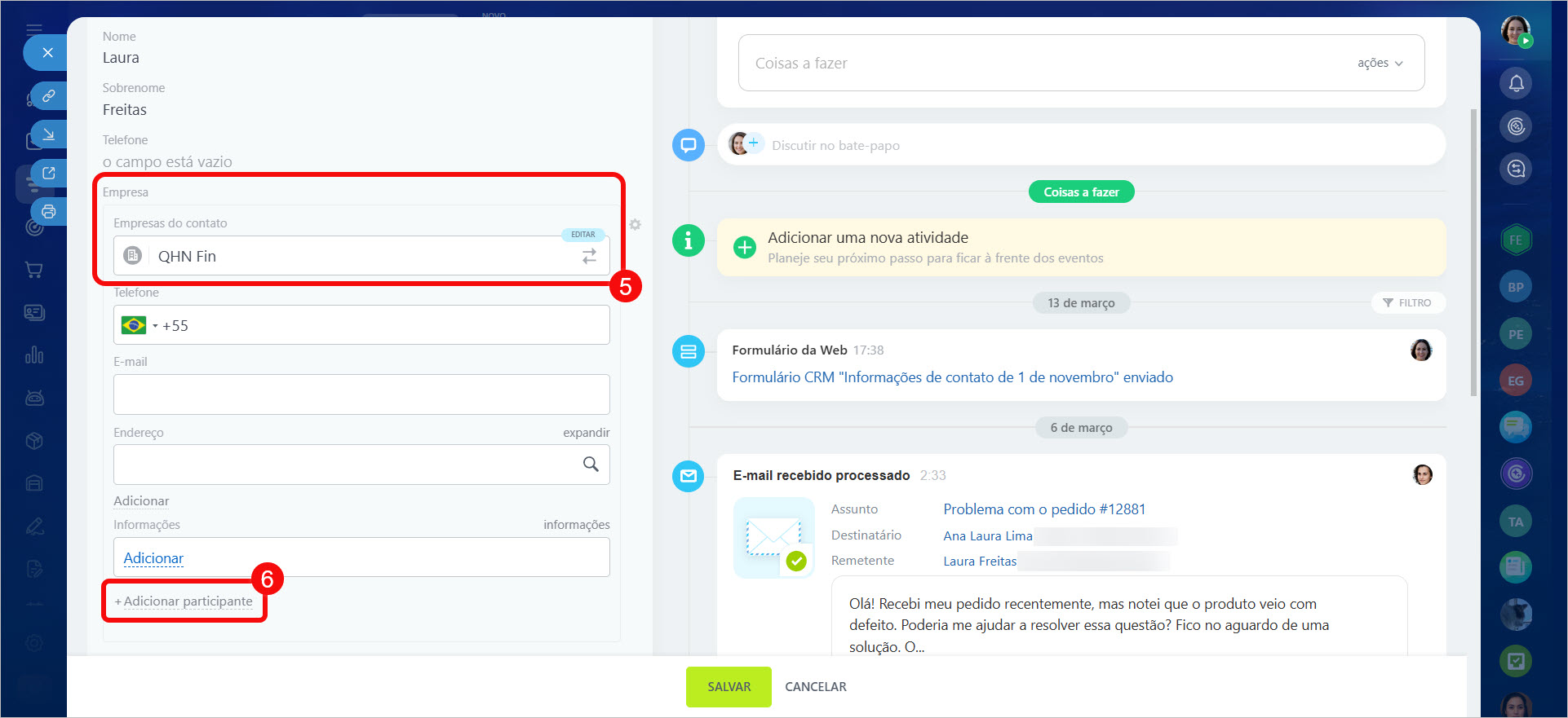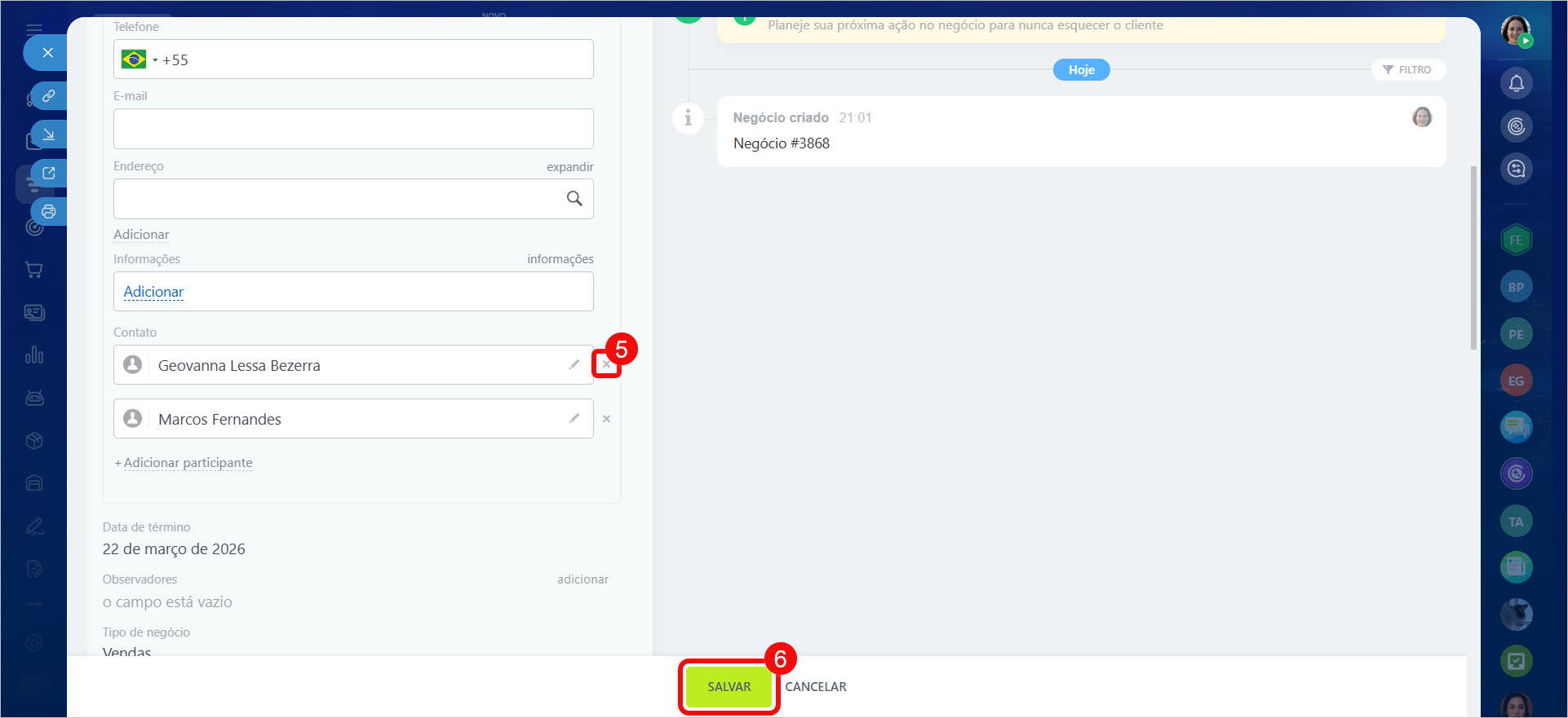 6–8. Clique em Salvar. O negócio será vinculado à empresa e aos contatos. Para ir ao cartão do elemento vinculado, clique no nome dele: no campo Cliente, nas abas Relações e Histórico.