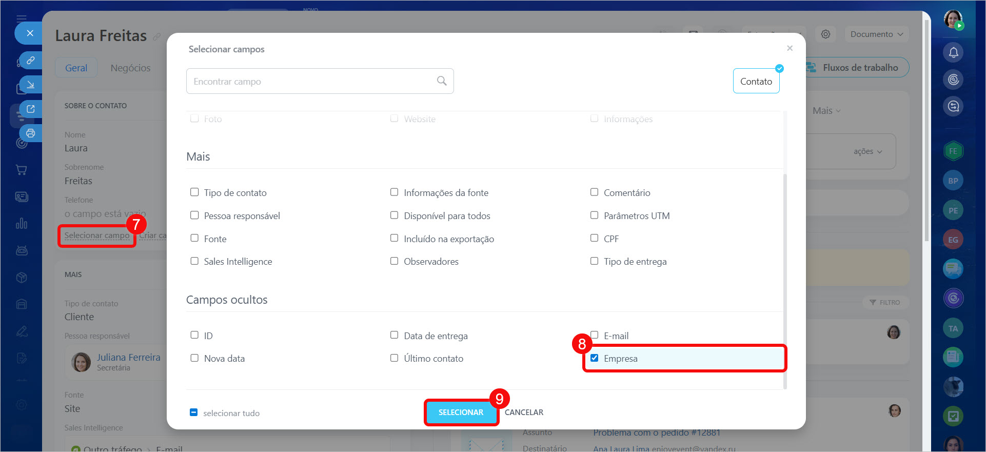 7–9. Se o campo Empresa não estiver aparecendo, significa que ele está oculto. Para exibi-lo novamente, clique em Escolher campo em qualquer seção do cartão e encontre o campo na lista ou através da busca. Marque a caixinha ao lado dele e clique em Selecionar.