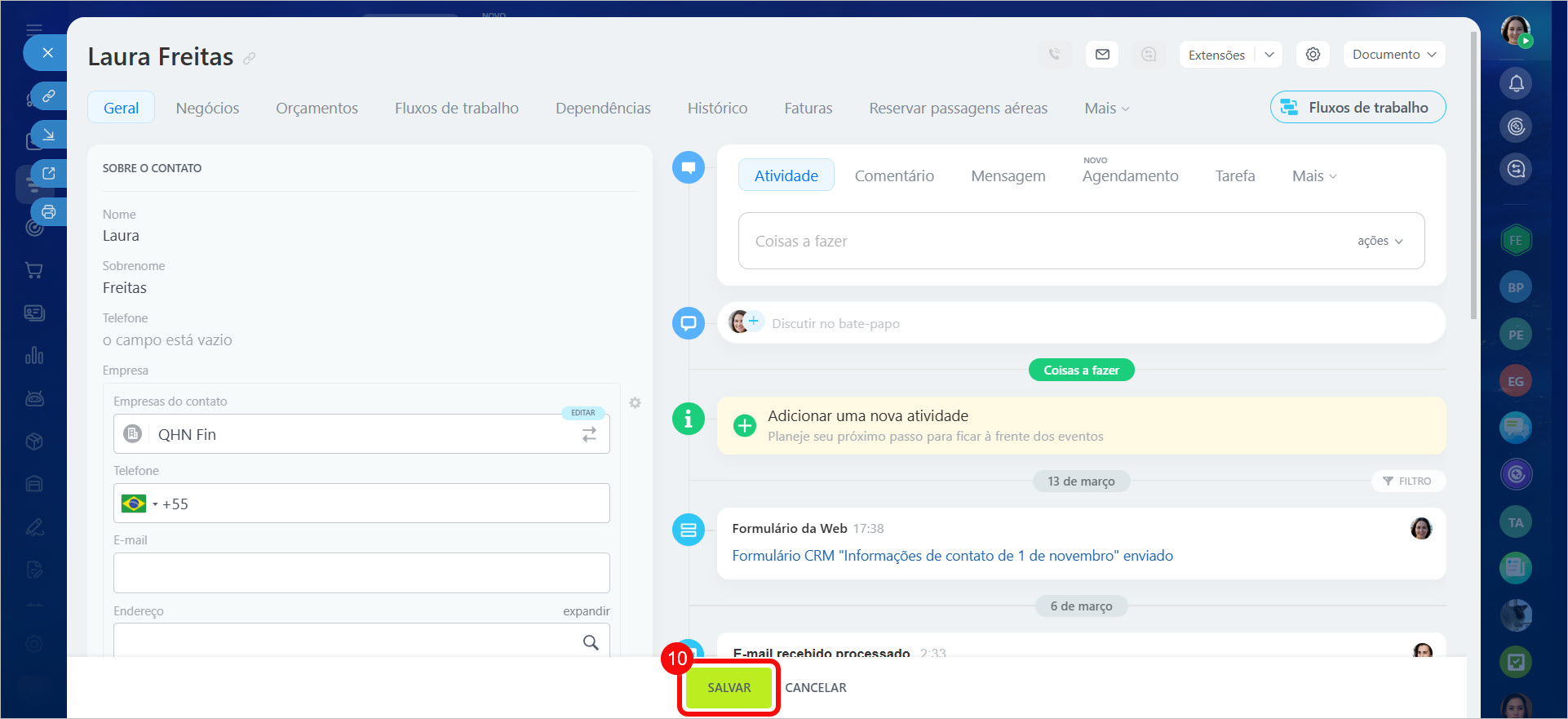 10. Quando adicionar as empresas desejadas, clique em Salvar. O contato será vinculado às empresas selecionadas, e o campo Contato nos cartões dessas empresas será preenchido automaticamente.