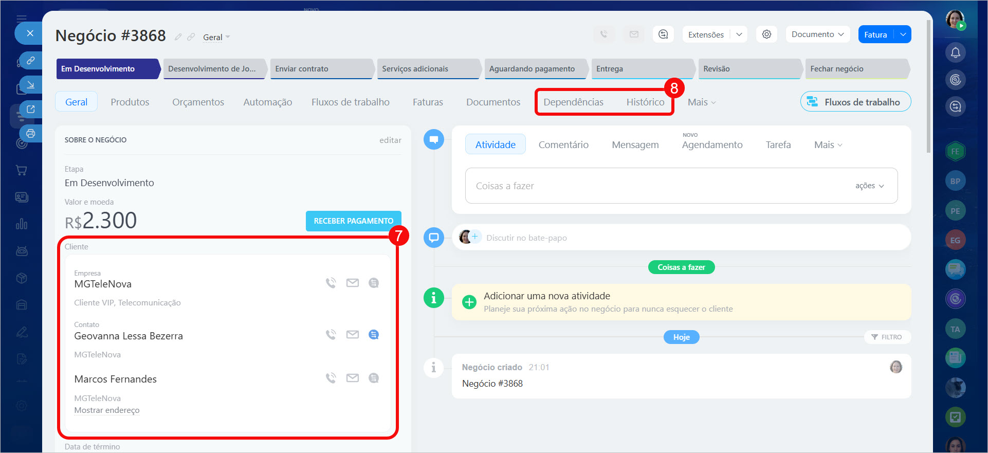 Contatos, empresas e negócios podem ser vinculados entre si. Assim, no cartão de cada elemento, você pode ver com o que ele está relacionado: quem representa a empresa, quais negócios estão em andamento e qual é o histórico de interações já existente. Isso ajuda a acessar rapidamente os dados necessários e a não perder o contexto.