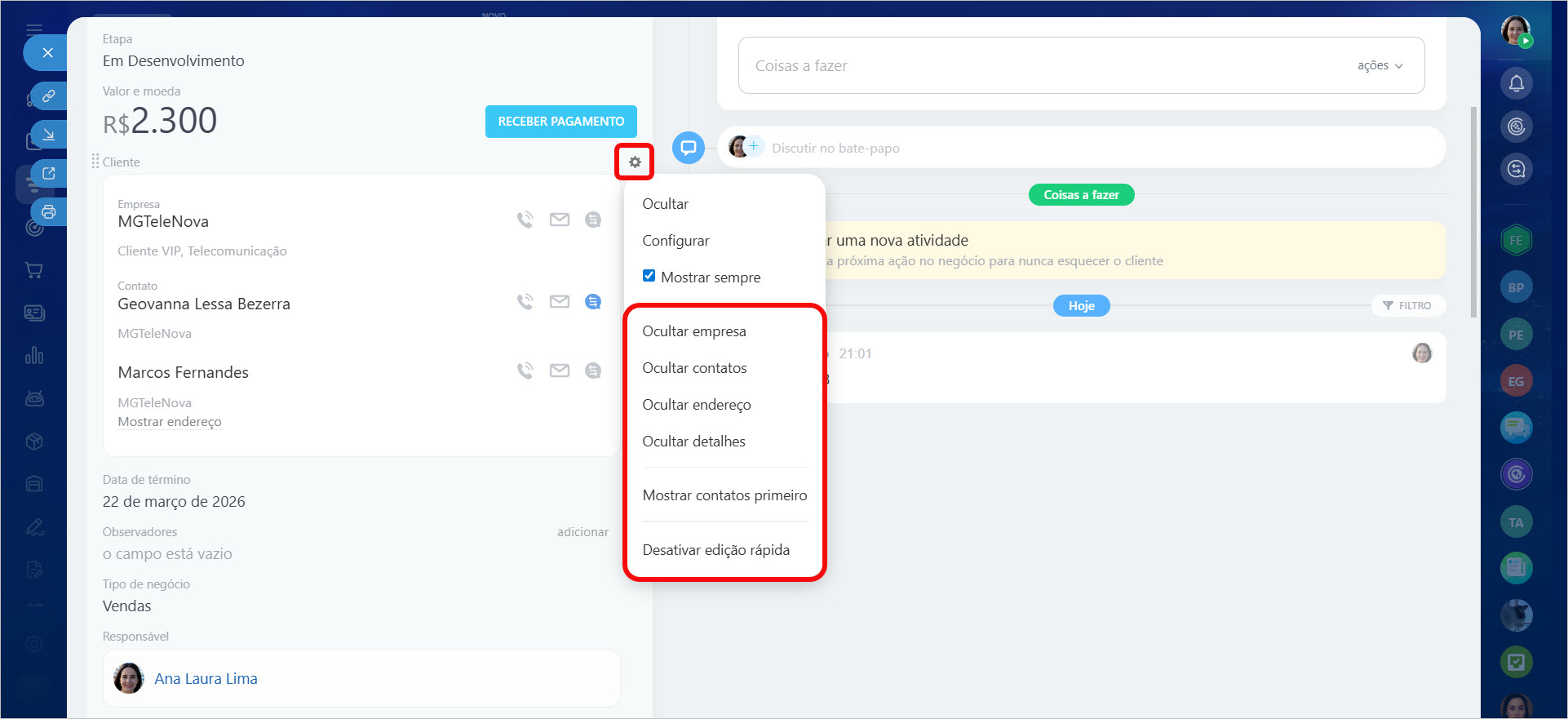 O campo Cliente no negócio pode ser configurado: passe o cursor do mouse sobre ele e clique em Configurações (⚙️).