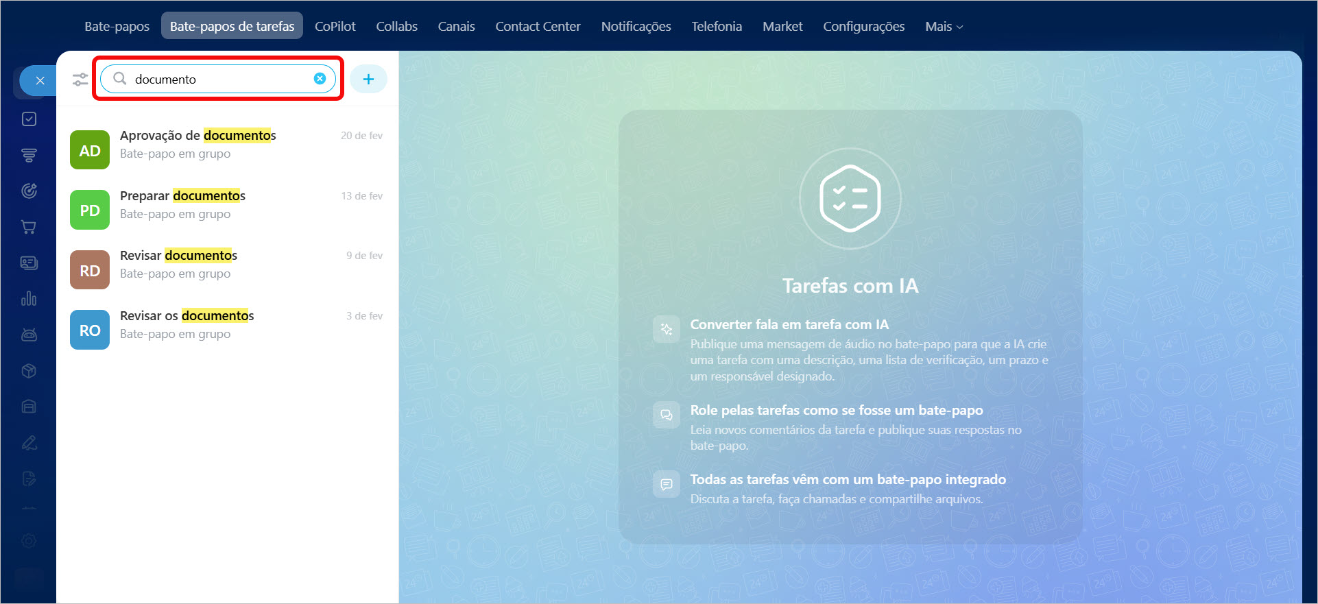 O recurso Bate-papo agora inclui busca na seção Bate-papos de tarefas. Digite parte do nome da tarefa para ver os bate-papos correspondentes na lista.