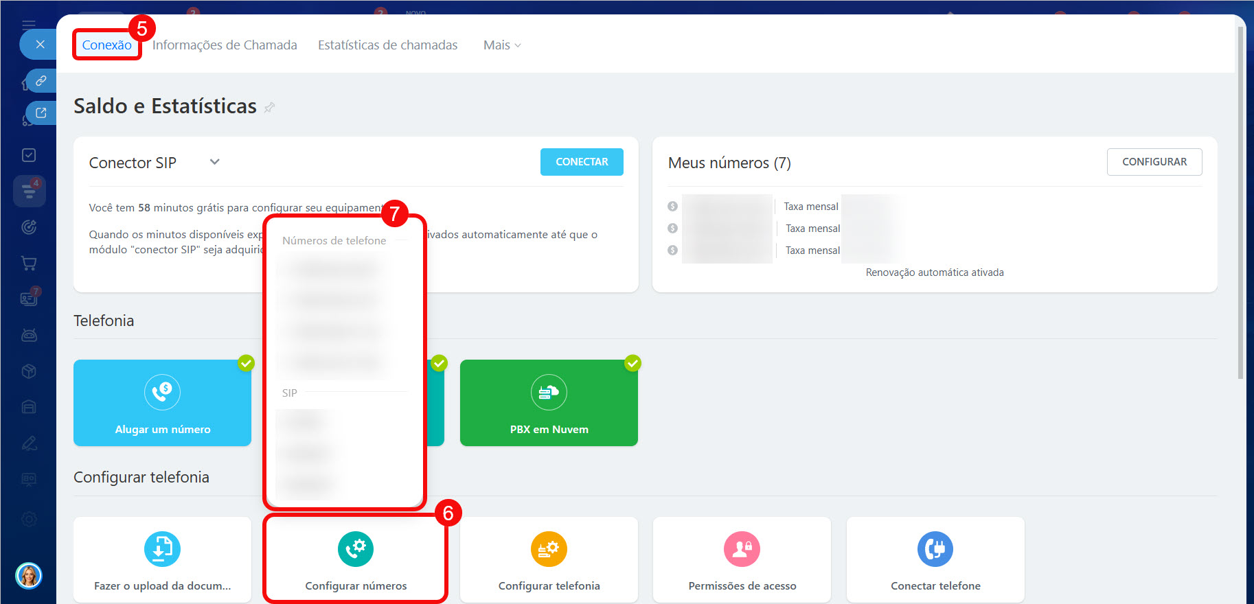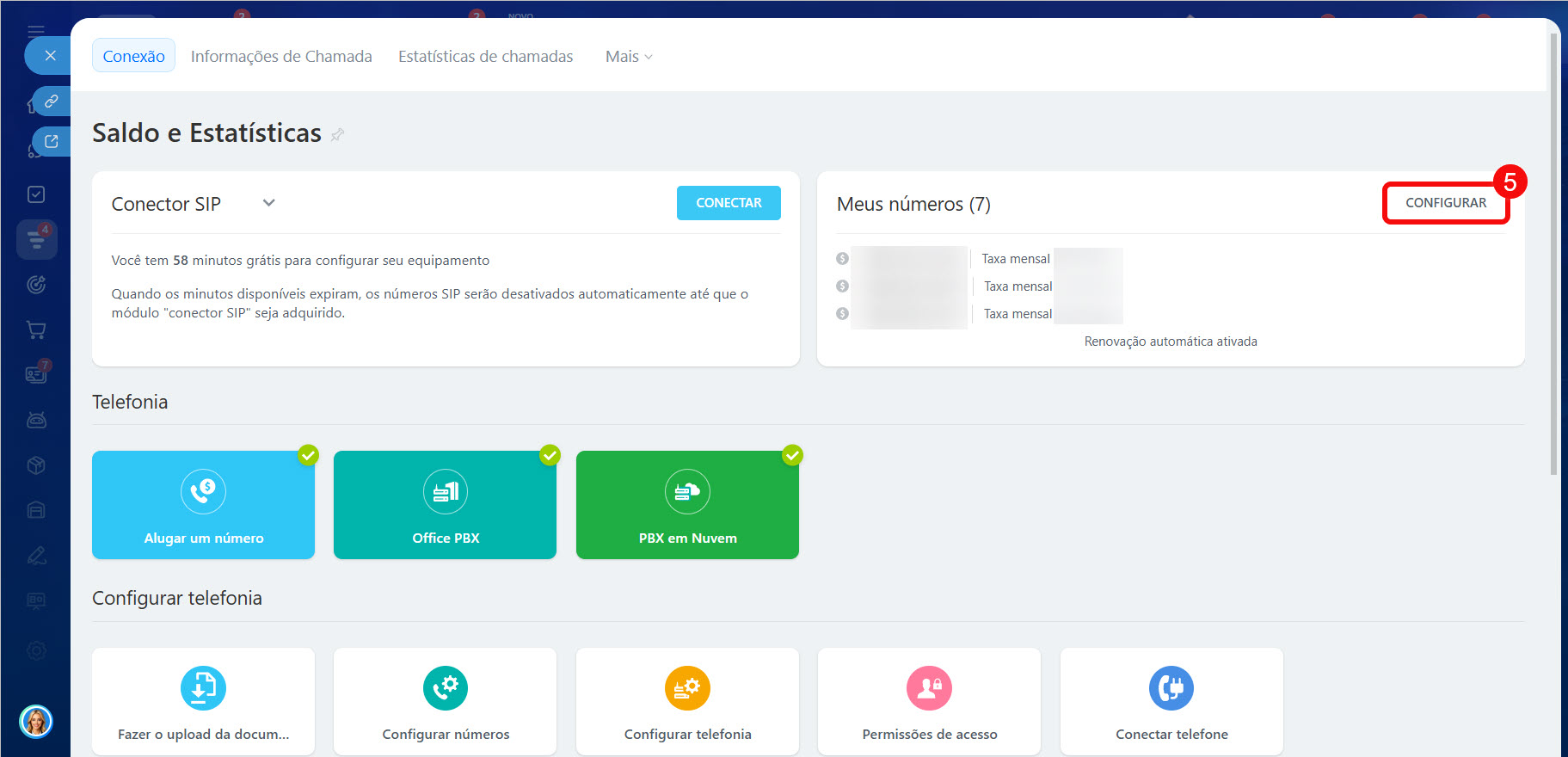5. Na seção Meus números, clique em Configurar. A lista de números será aberta.