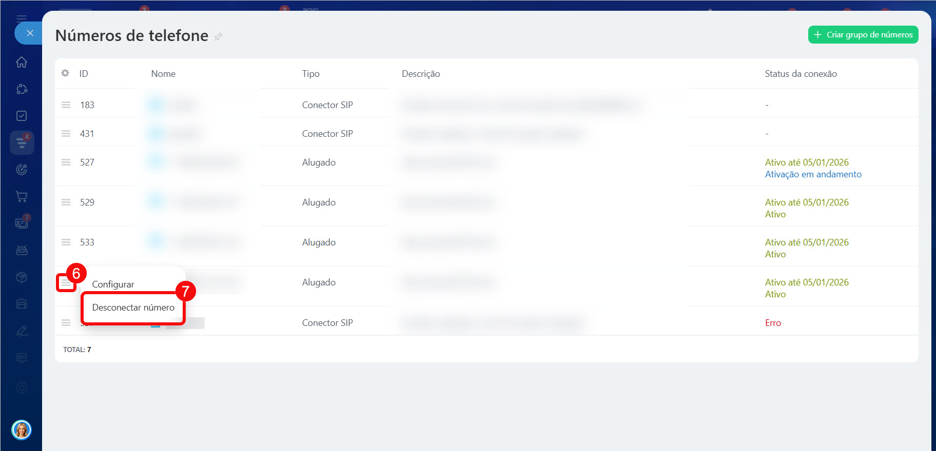 É possível desativar o número a partir da lista geral de números ou nas configurações de um número específico. Escolha a forma mais conveniente para você.