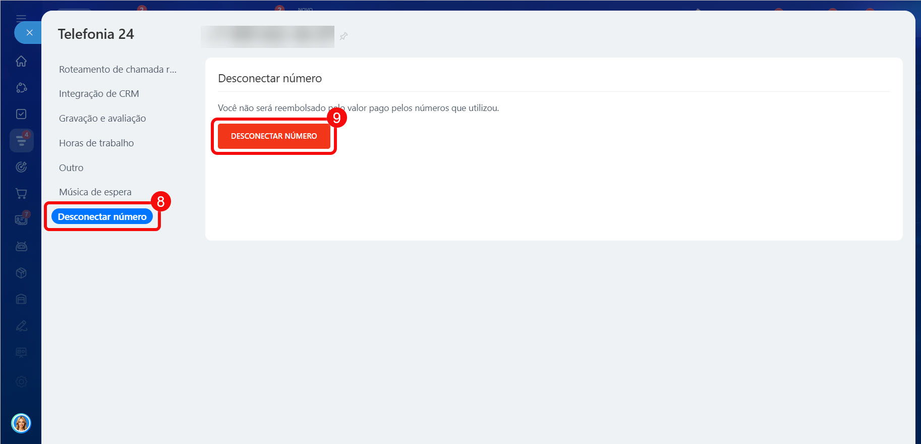 9. Clique em Desconectar número.