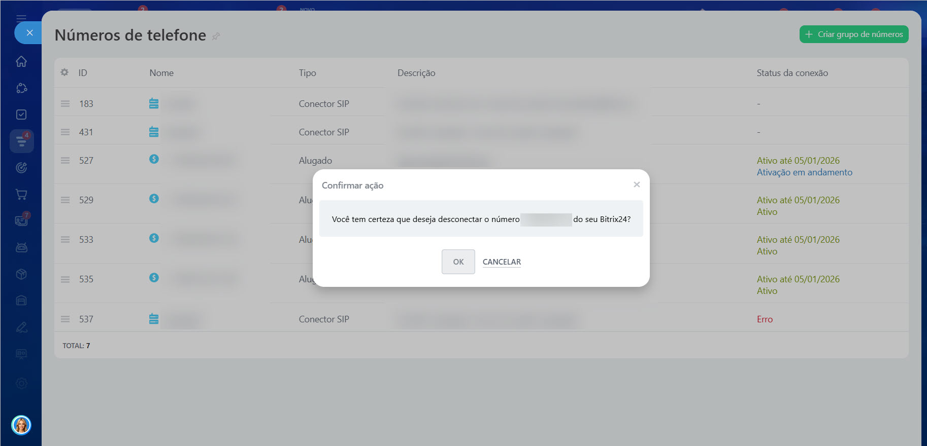 - Depois que você clicar em Desconectar número, uma janela pop-up será exibida para confirmação. Clique em OK para confirmar a desativação ou Cancelar para não desativar o número.