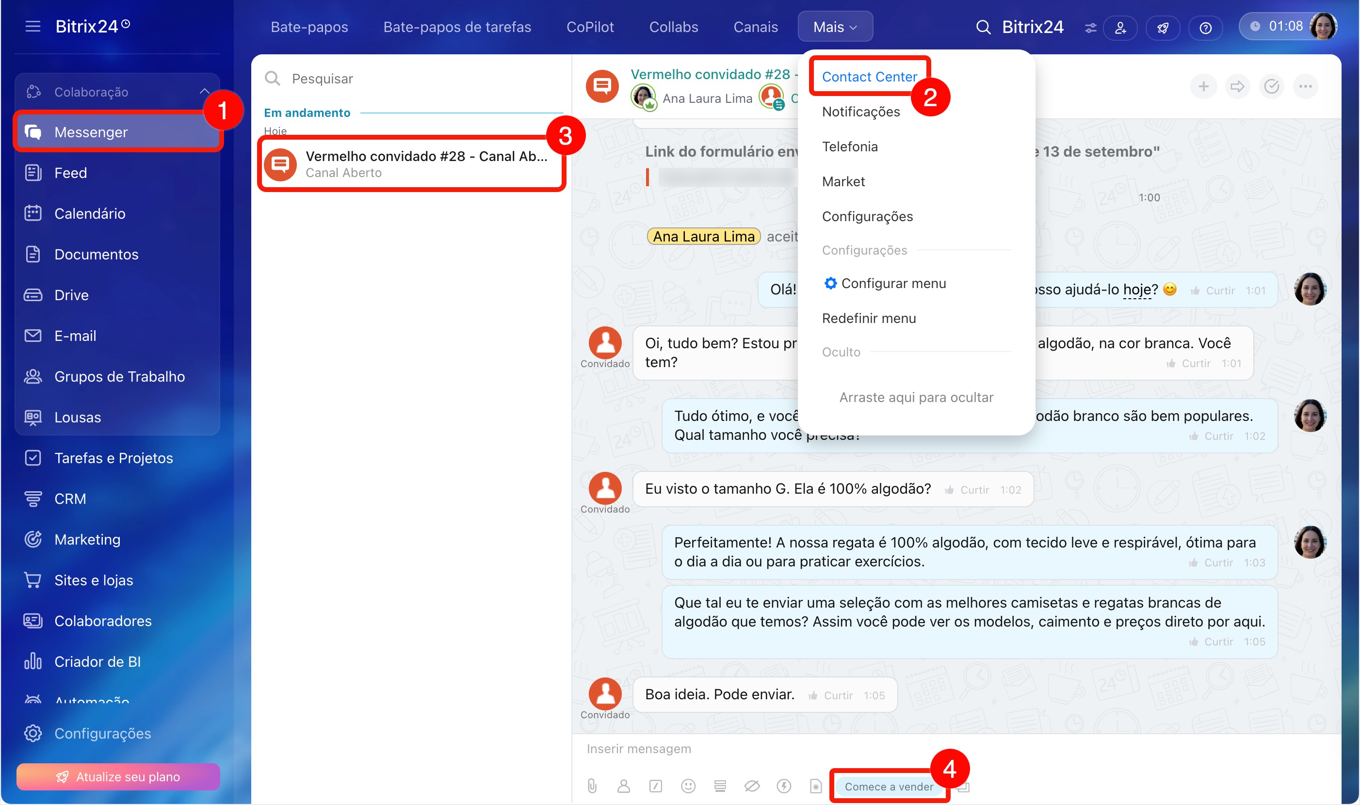1–4. Acesse Messenger > Contact Center. Abra a conversa com o cliente. Na parte inferior, clique em Vendas no chat.