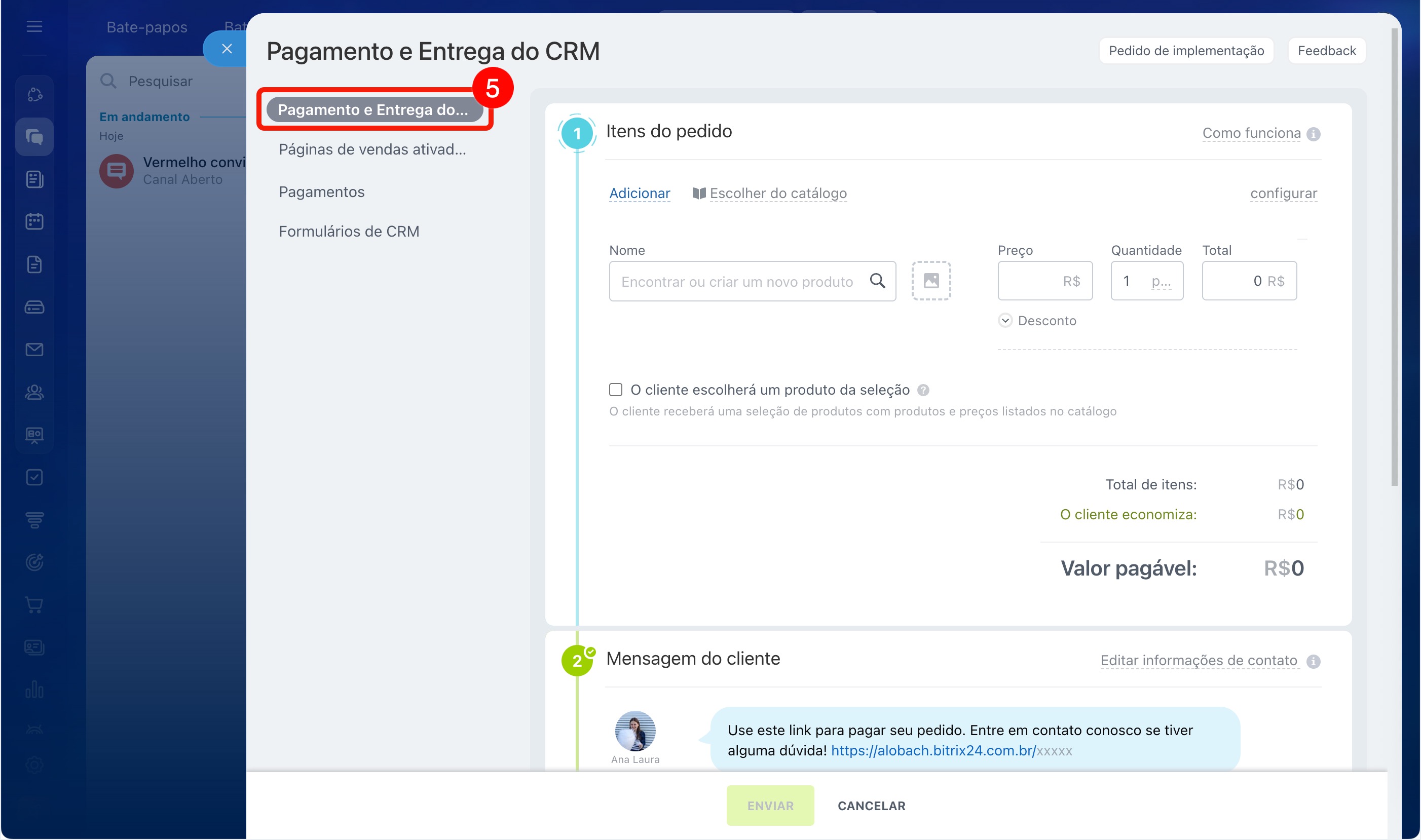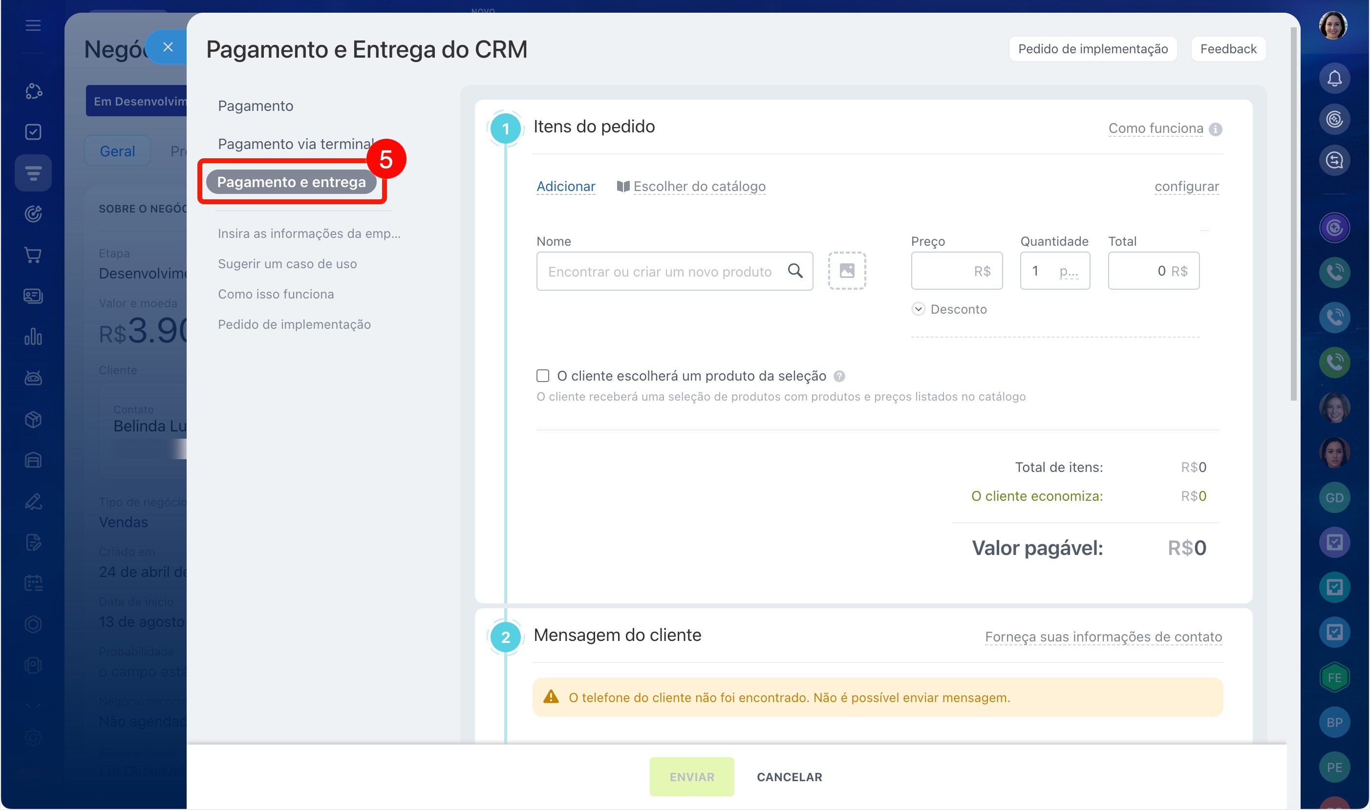 5. Selecione o cenário CRM. Pagamento e entrega.