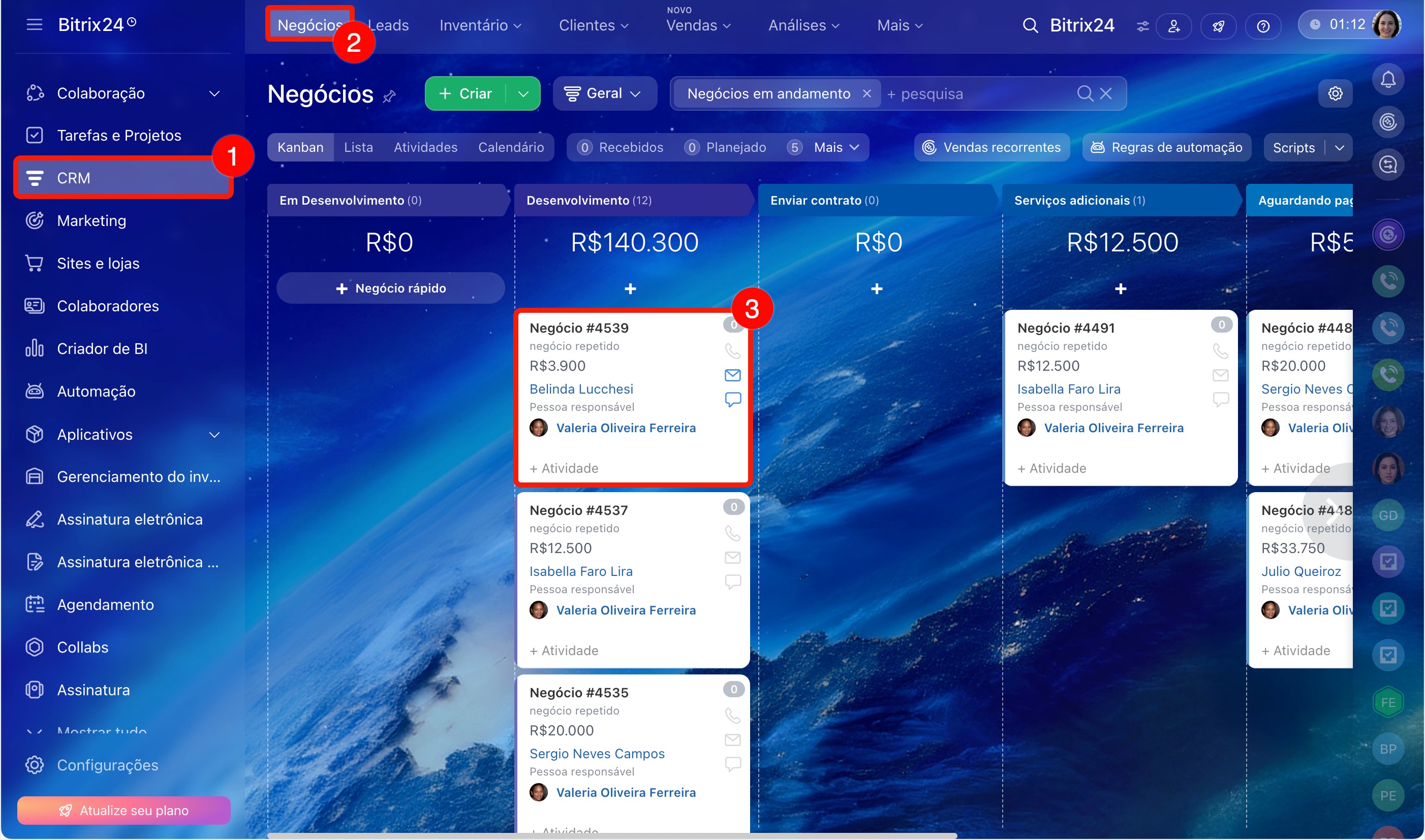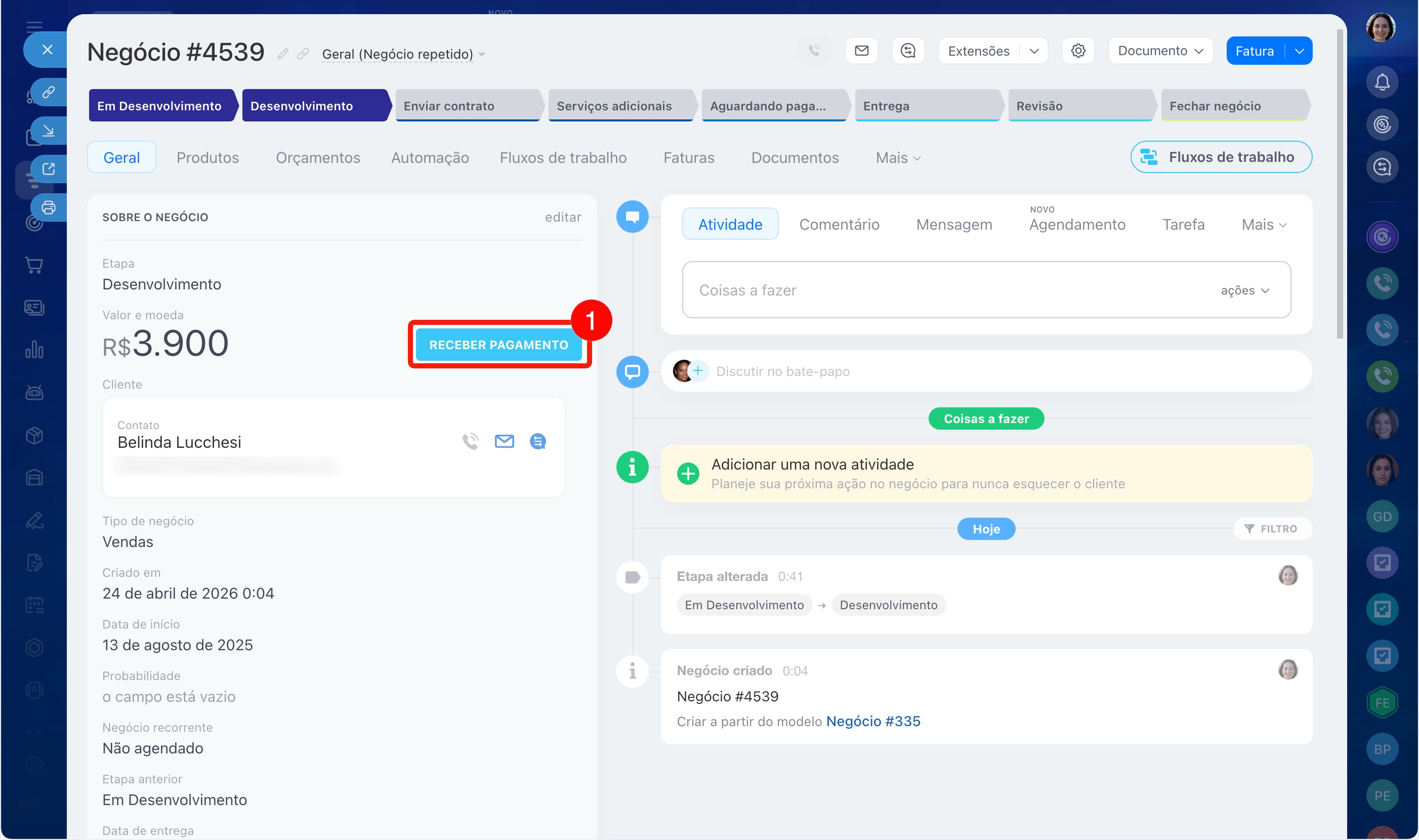 1–3. Acesse CRM > Negócios. Abra o negócio desejado.