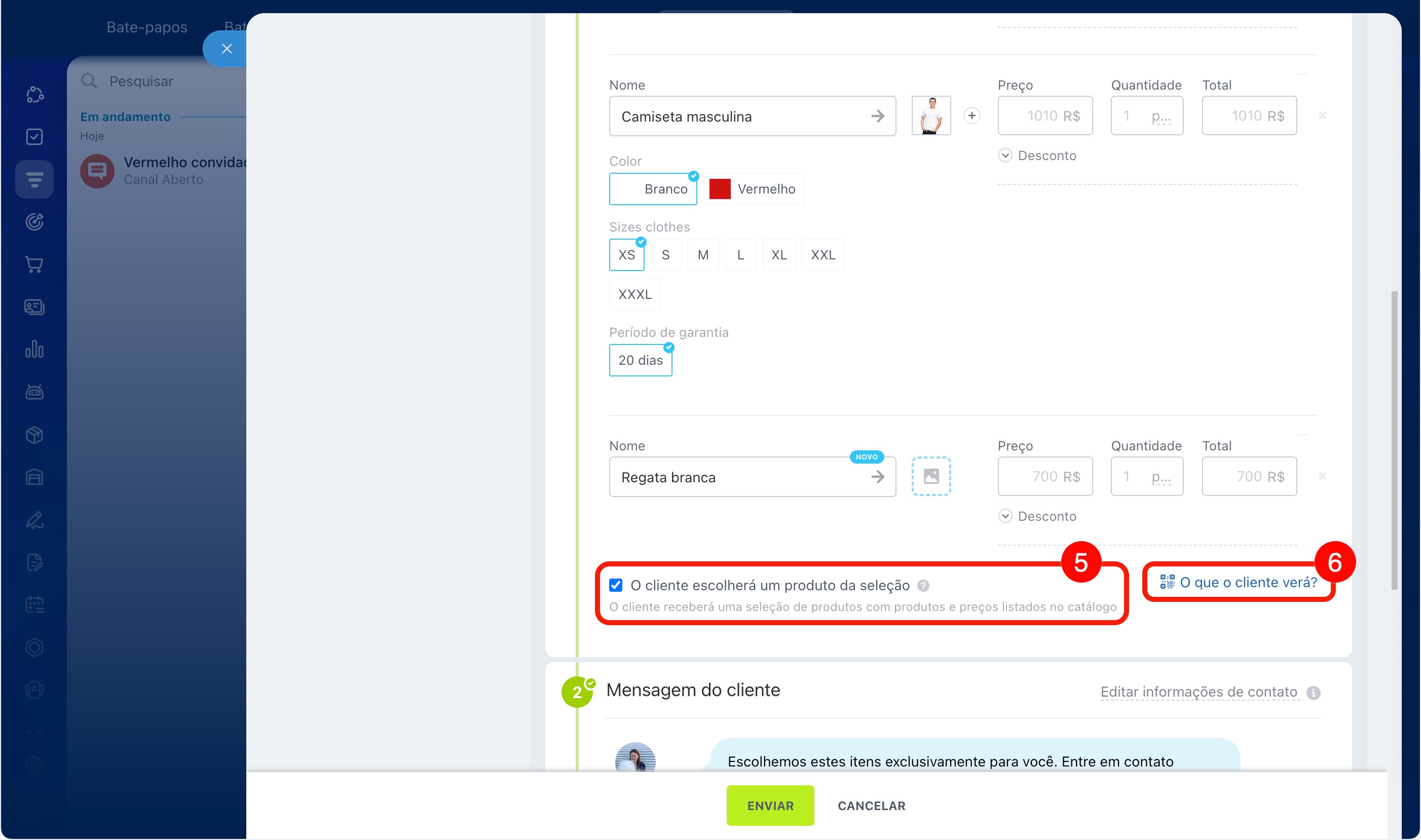 - Antes de enviar, adicione os produtos à seleção: eles podem ser selecionados do catálogo ou criados no painel deslizante. Ative a opção O cliente escolherá o produto da seleção.
