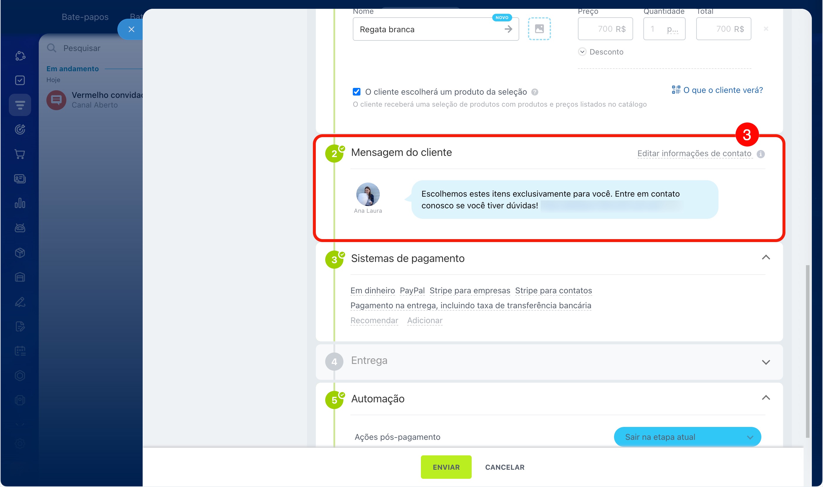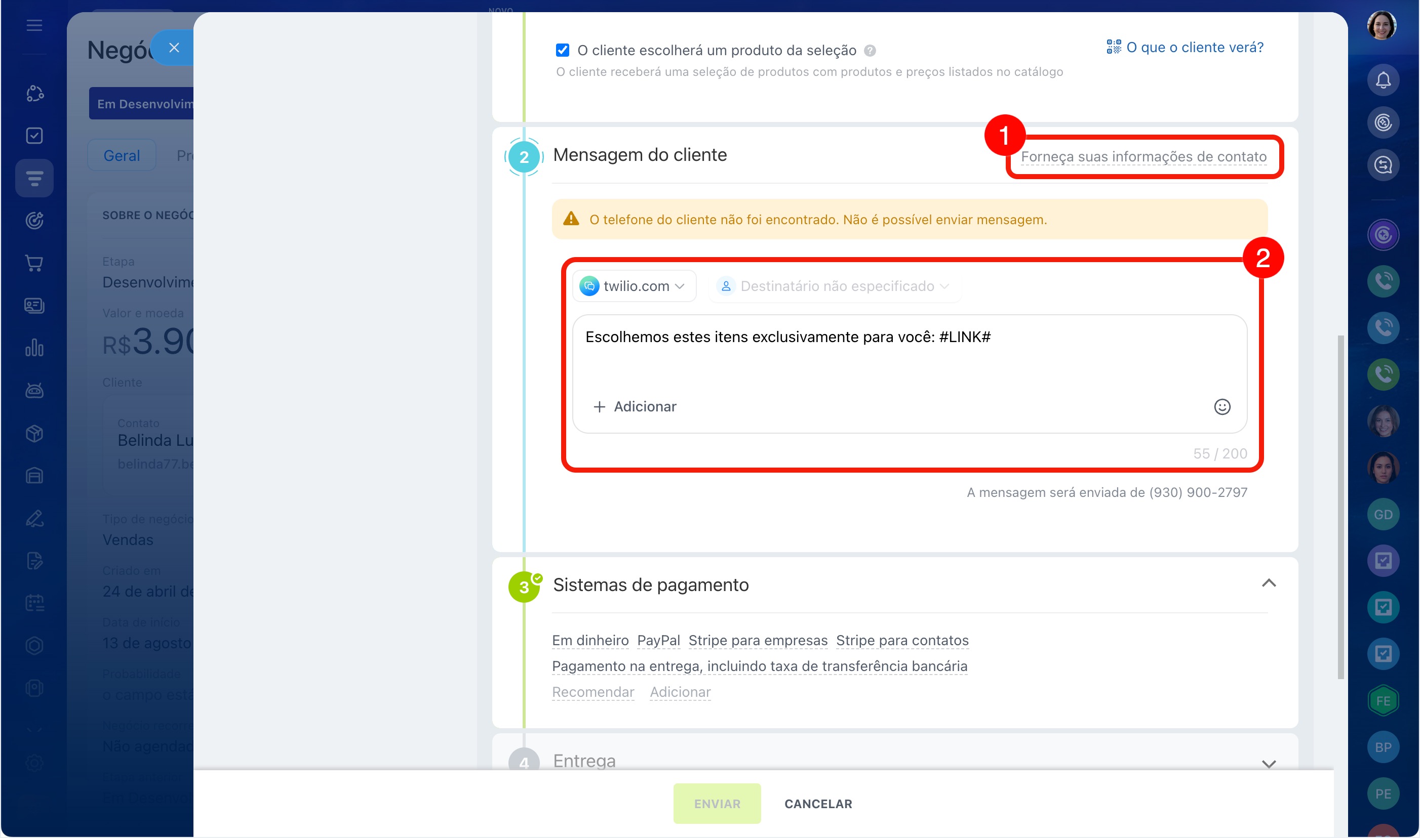 Mensagem ao cliente. Verifique os contatos do cliente e escolha as opções de envio. Elas dependem se você está enviando a seleção por SMS ou pelo chat do Canal Aberto.