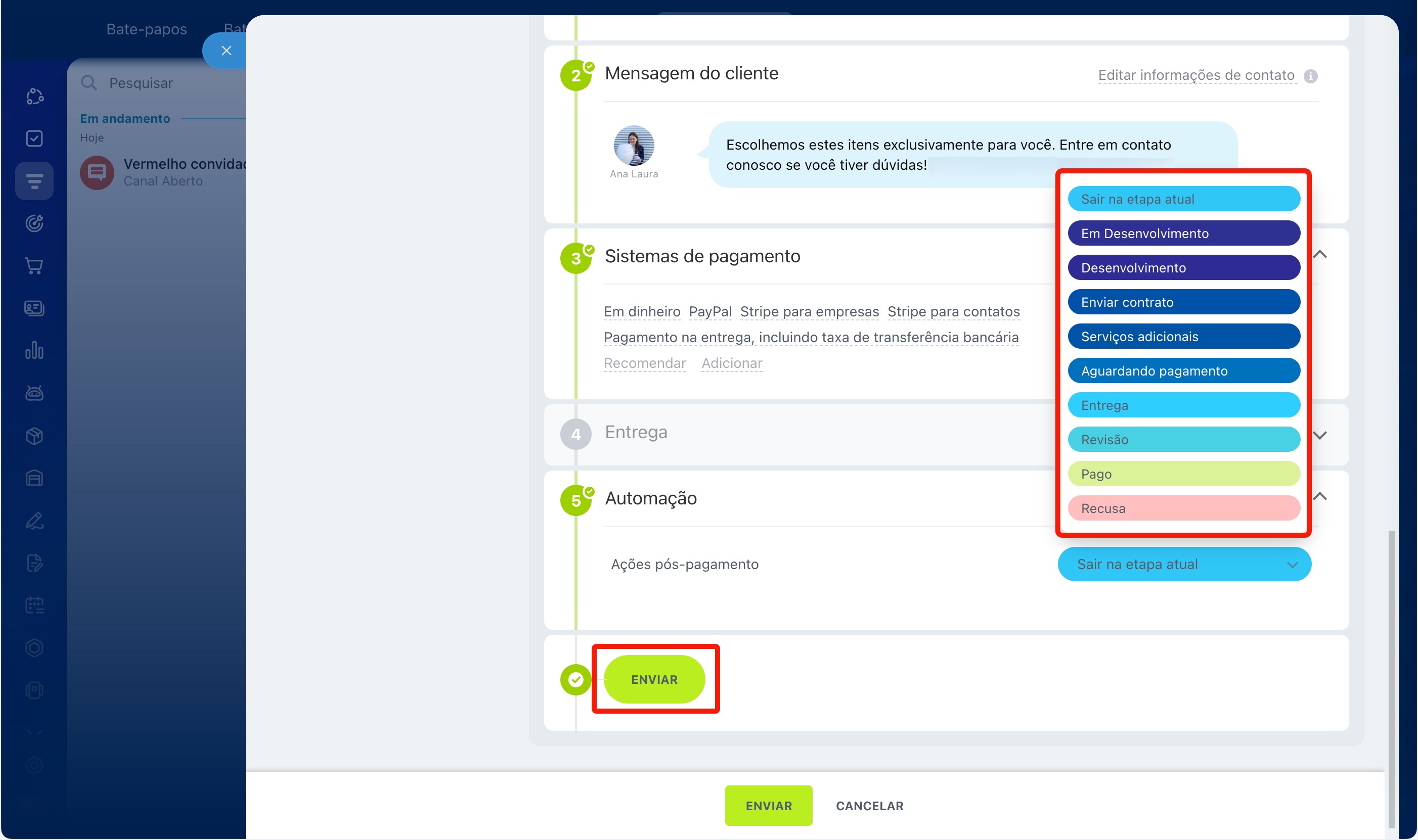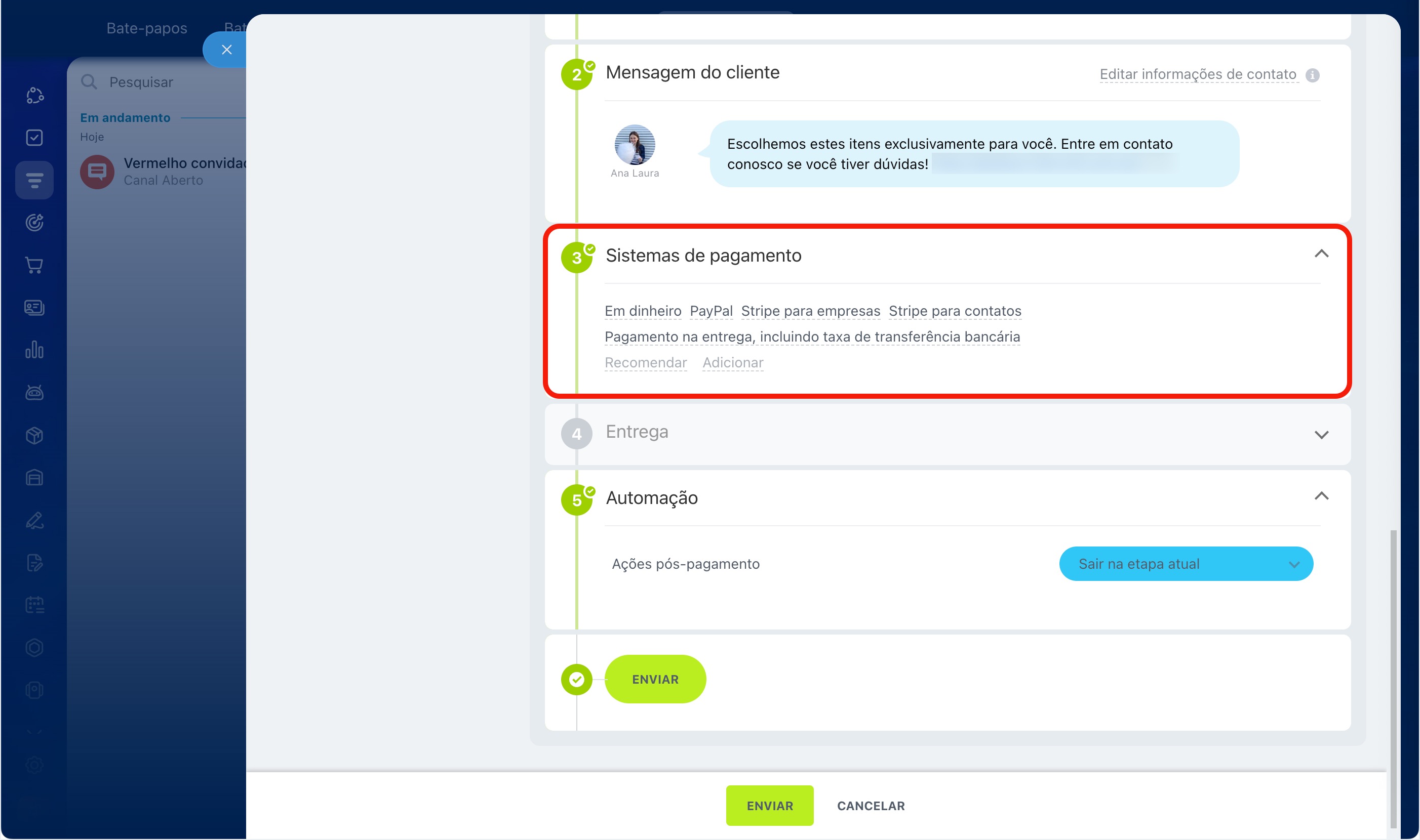 Automação. Escolha para qual etapa o negócio será movido automaticamente após o pagamento e a conclusão da entrega, para não precisar mover a página manualmente. Por padrão, a página permanece na etapa atual.