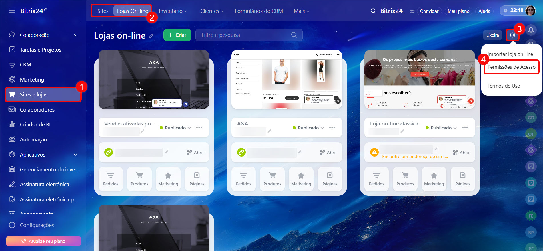 - As permissões de acesso para sites e lojas on-line são compartilhadas. Se você as alterar na seção Sites, elas também serão aplicadas à seção Lojas.