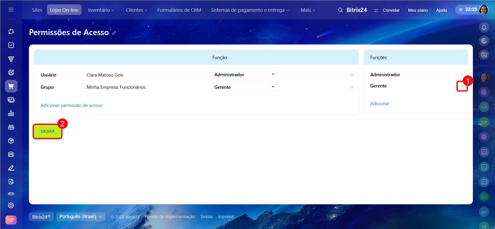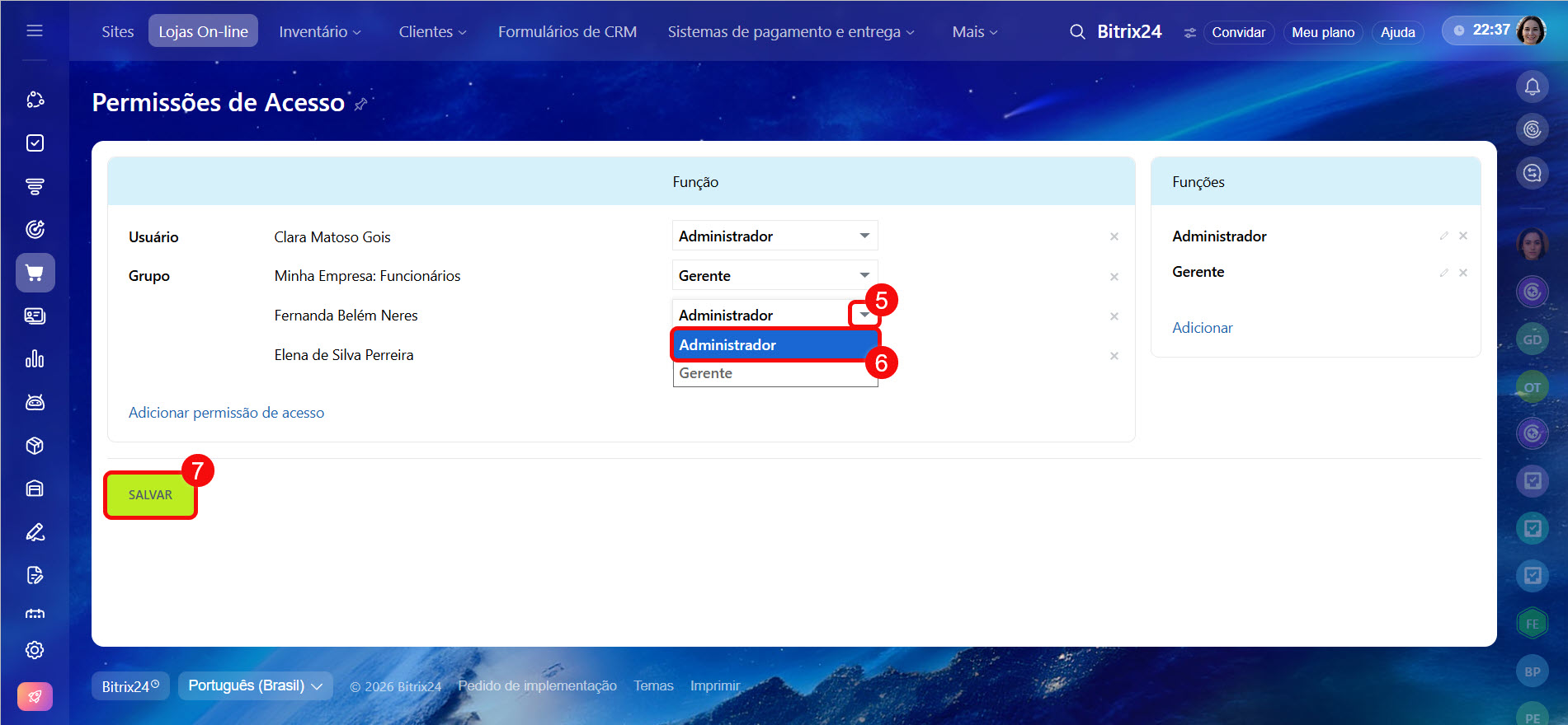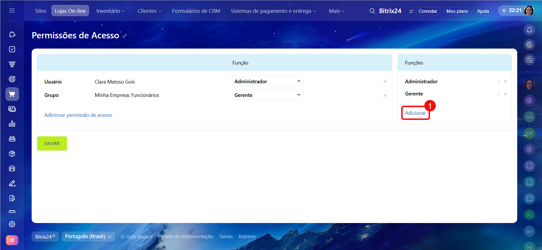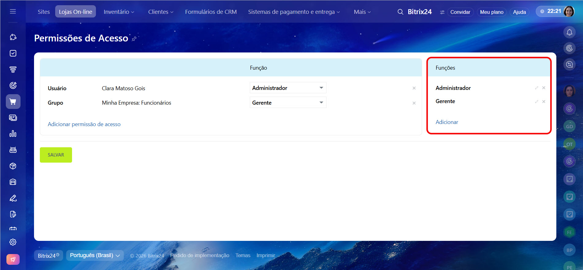 - Para sites e lojas on-line, existem duas funções padrão: administrador e gerente.
