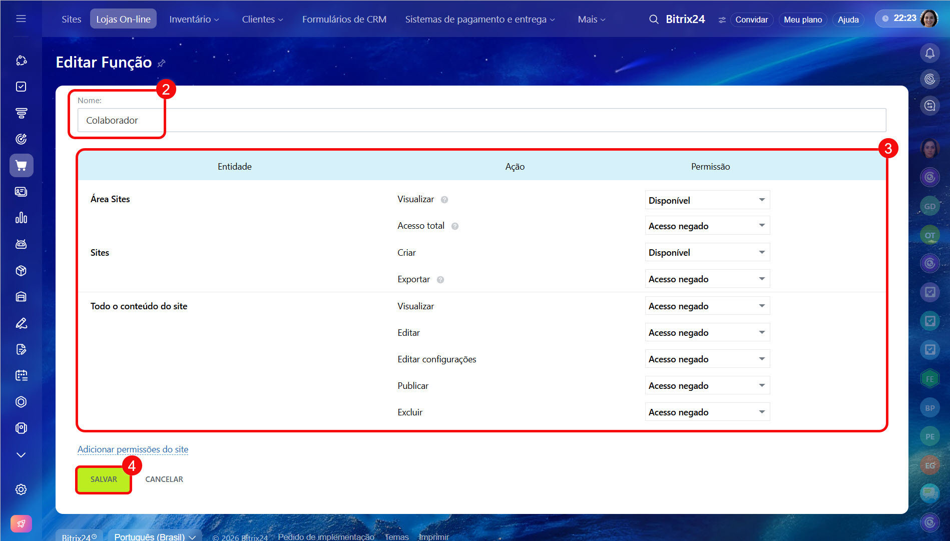 - Para cada função, você pode configurar permissões de acesso para ações com a seção Sites e Lojas, com o conteúdo de todos os sites e lojas, e com um site ou loja específicos.