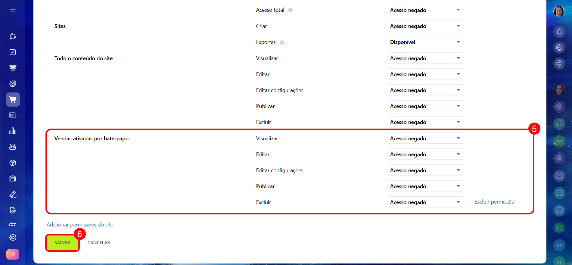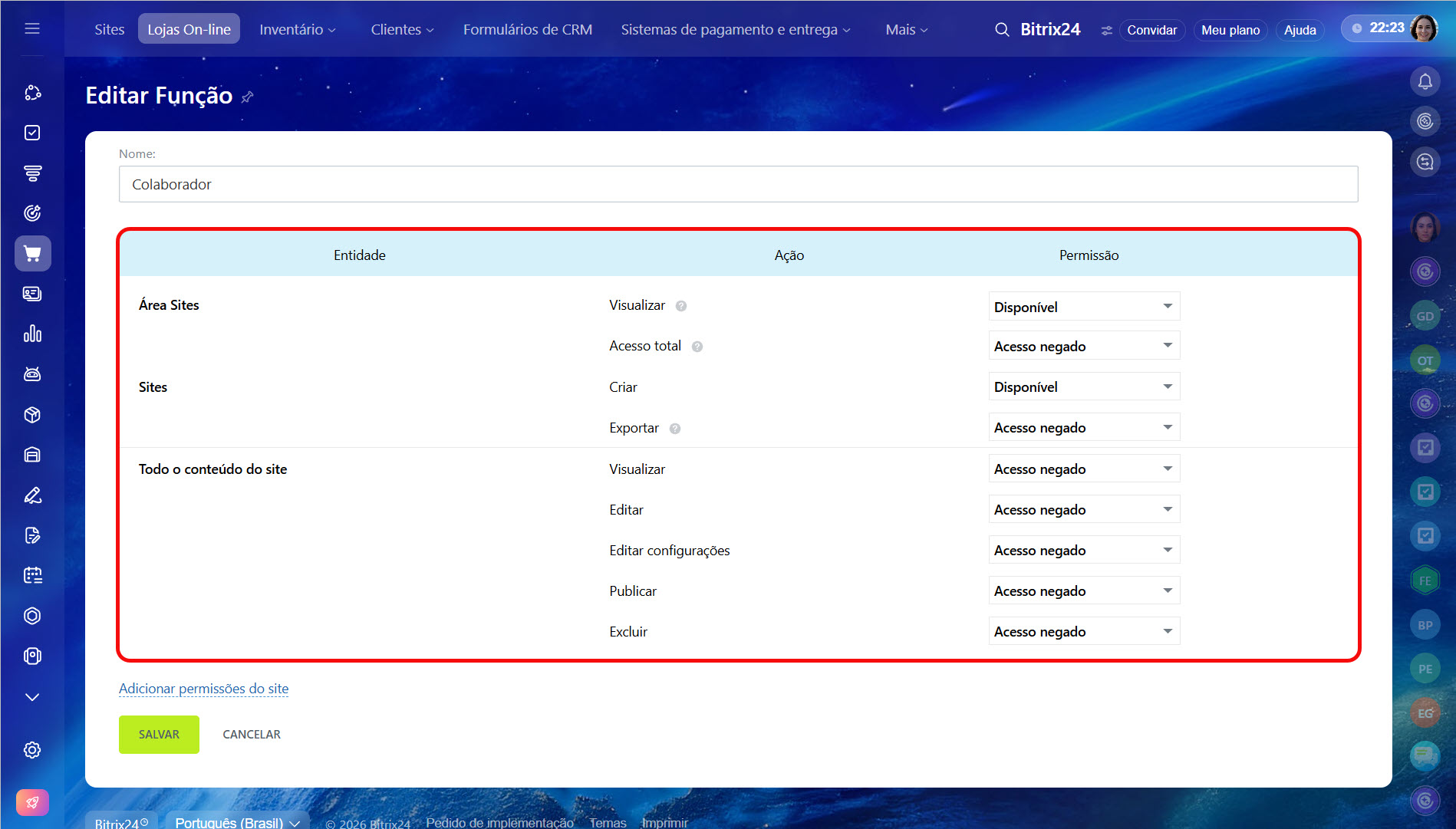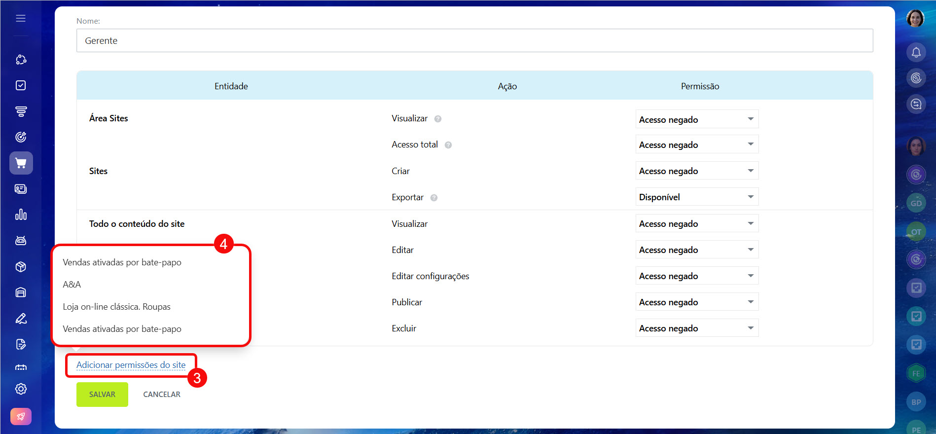 As permissões de acesso para sites e lojas on-line são compartilhadas. Se você as alterar na seção Sites, elas também serão aplicadas à seção Lojas. As configurações podem ser abertas em qualquer uma dessas seções.