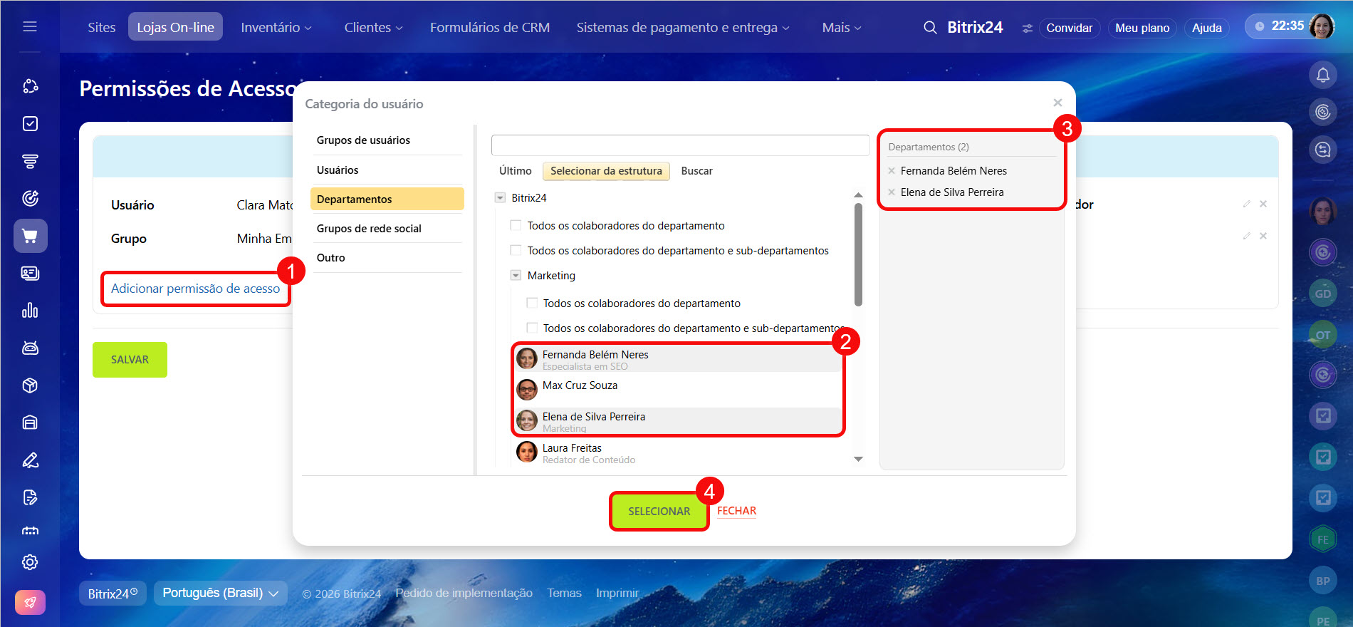 1–4. Clique em Adicionar permissão de acesso. Selecione o colaborador, departamento ou grupo: eles aparecerão na lista à direita. Clique em Selecionar para prosseguir para a escolha das funções.