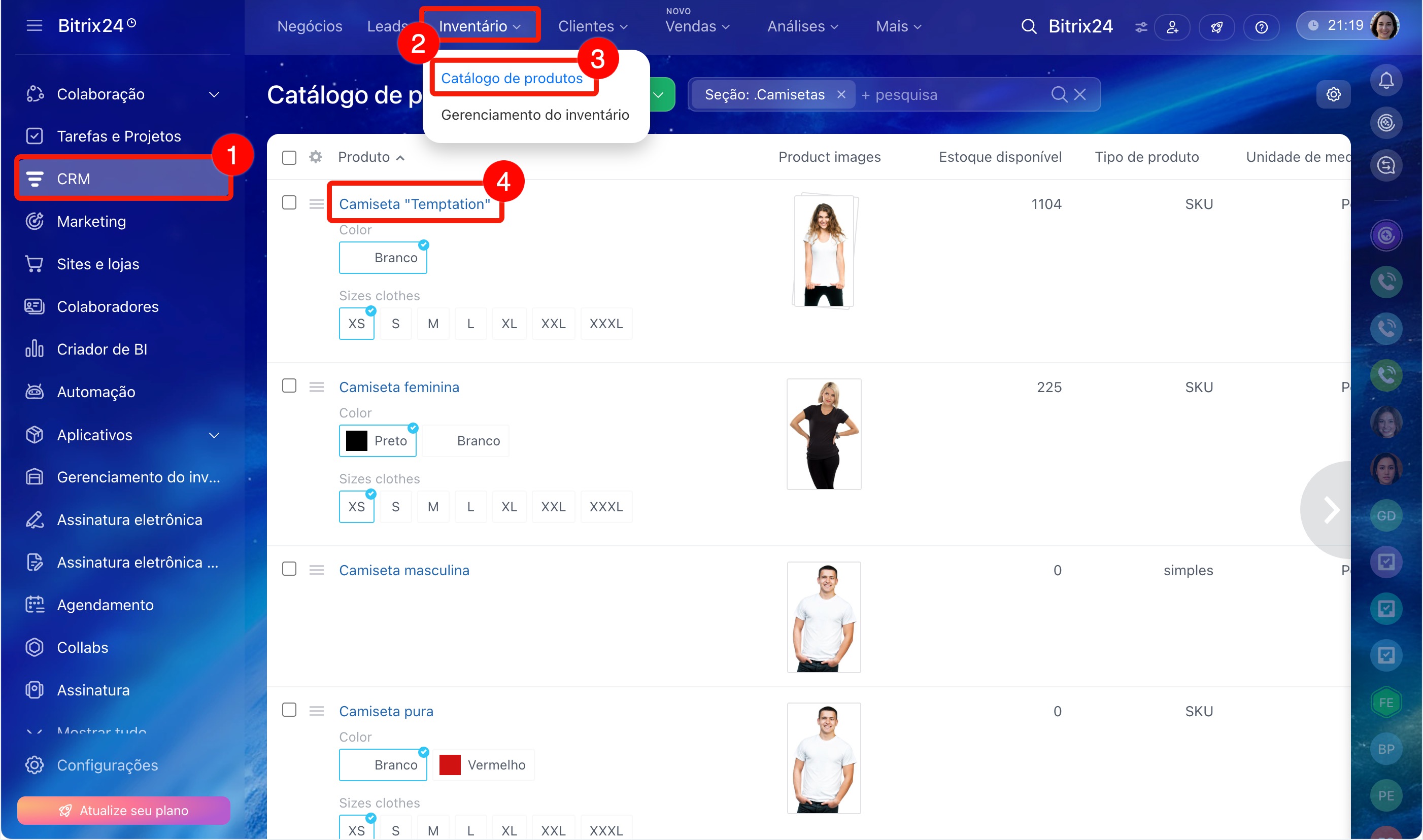 Uma variação no Bitrix24 é uma versão específica do produto com as características escolhidas. Por exemplo, uma camiseta azul tamanho M.