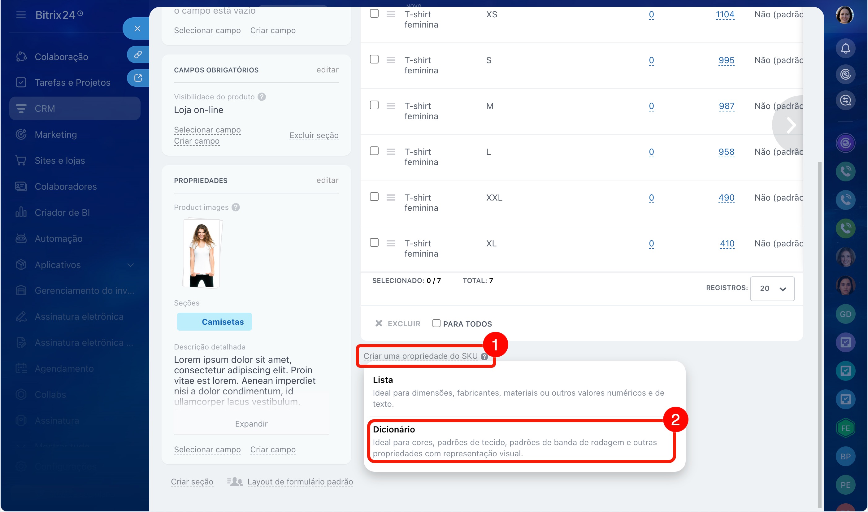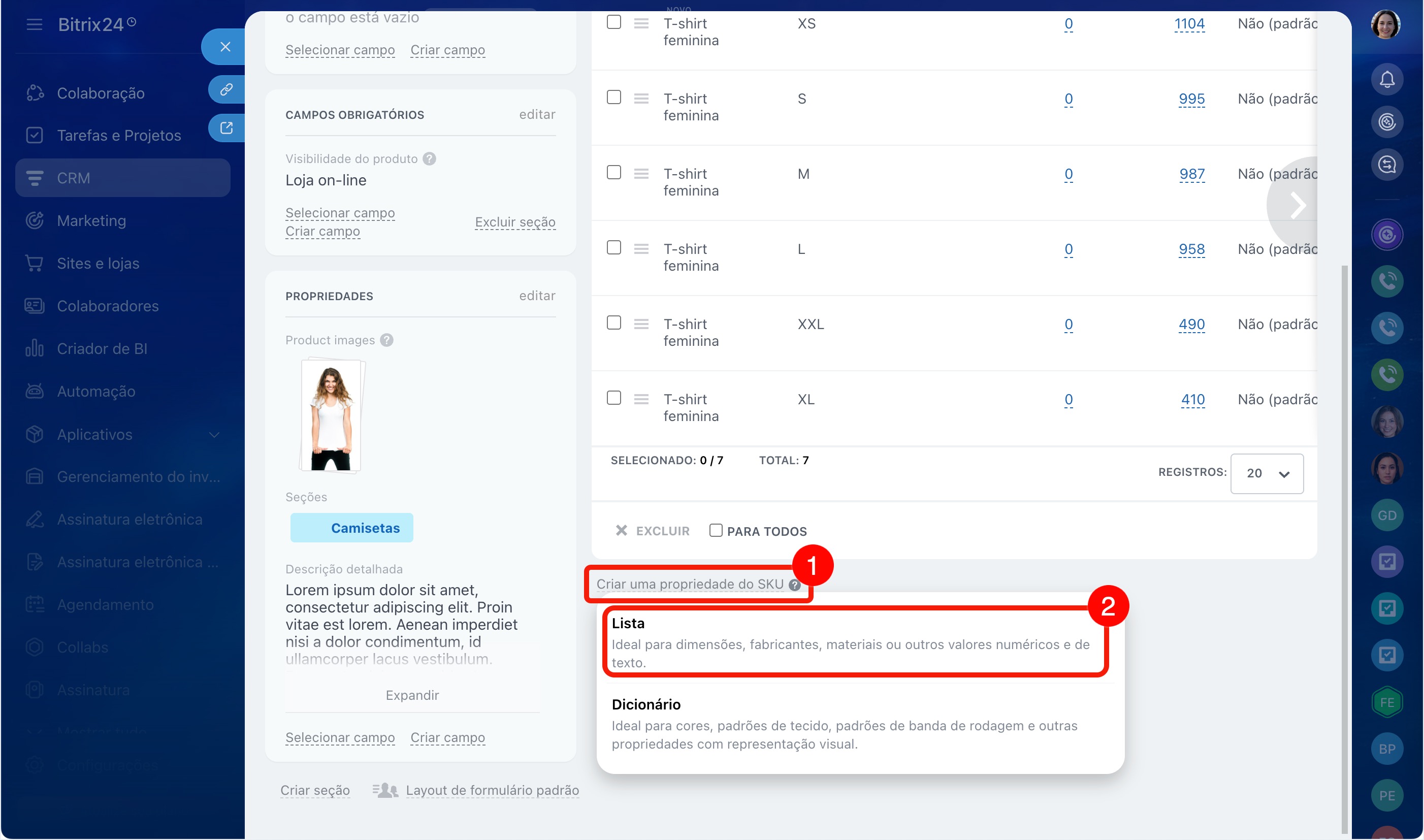 No Bitrix24, existem dois tipos de propriedades de variação: Lista e Dicionário. Vamos ver como criá-las usando o exemplo de uma camiseta com diferentes tamanhos e cores.